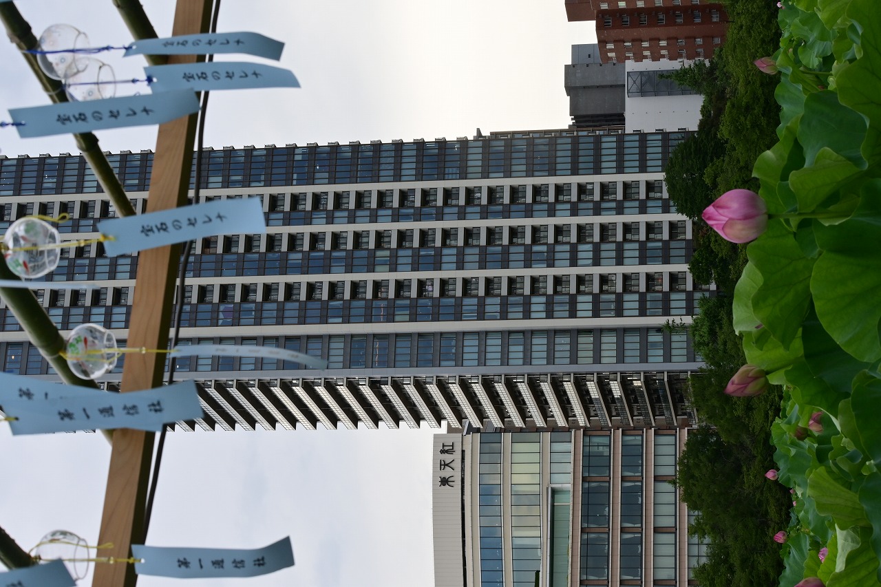 合間に不忍池ではハスの花が見頃を迎え、風が吹くと風鈴がチリン・チリンとほとりに清らかに鳴り響き・見物客に幸せをもたらしてるようでした。昼過ぎに突然豪雨がふられて、開いたハスが見れなくて残念でした。ハスは朝開いて夕方に萎みます。
