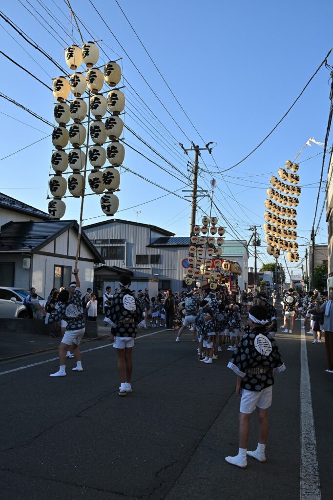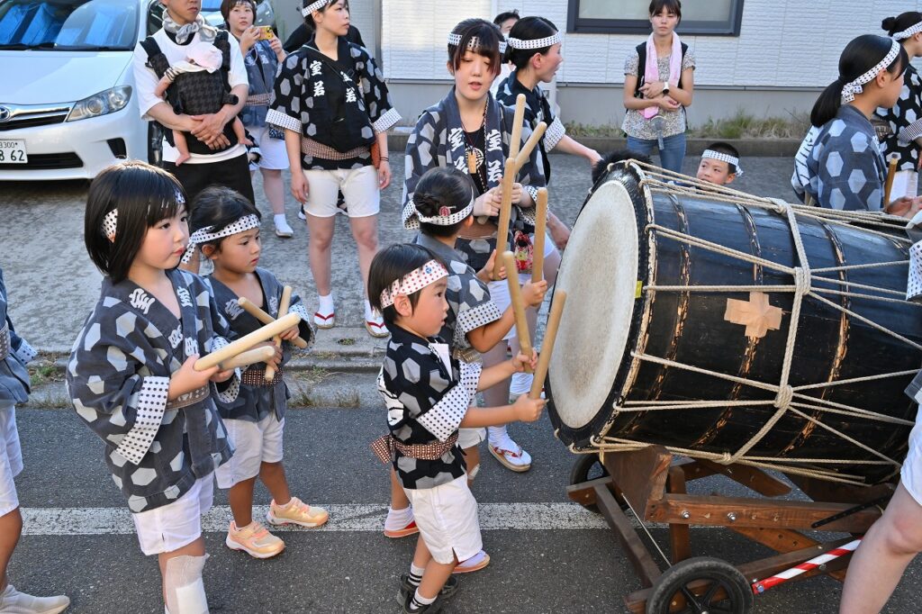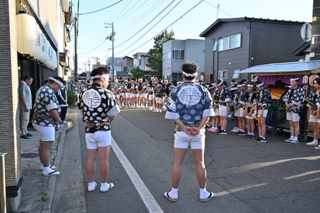 3日から6日まで竿燈まつりが開幕。私の町内である室町(現在の旭南一丁目)では、3日午後5時半から出陣式が行われました。神事で祝詞奏上と安全祈願が行われ、続いて黙祷、町内会長の挨拶がありました。その後、軽快なお囃子が響き始めると気持ちが高まり、ワクワクする中で「どっこいしょー、どっこいしょー」の掛け声に合わせ、差し手たちが磨き上げた妙技を披露。町内の皆さんに見送られながら、「幼若・小若・大若」が元気に竿燈会場へと出発しました。
