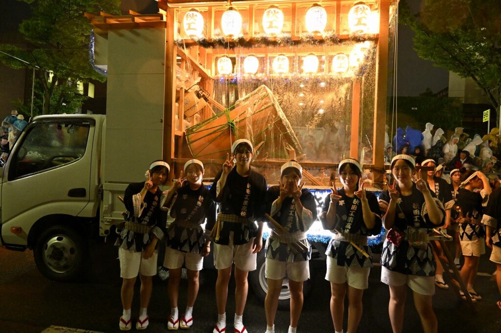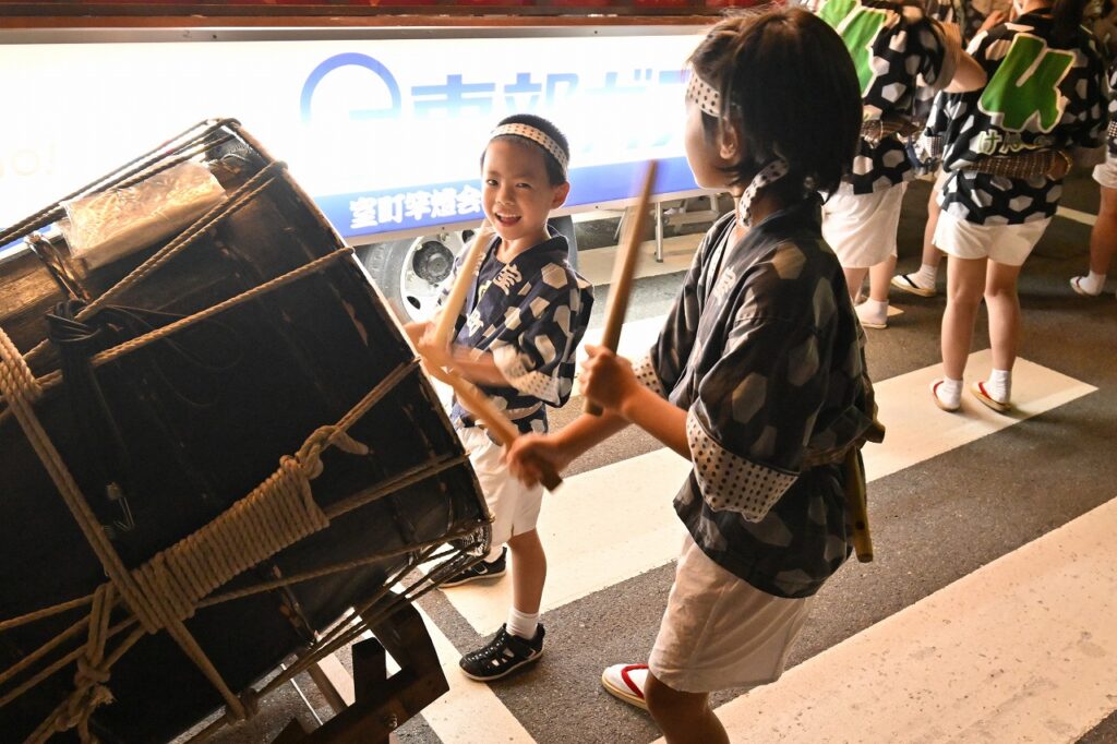 私は初日と3日目、4日目に行きましたが、両脇の歩道は観客でいっぱいで移動が困難で、秋工会の竿燈を探すのに苦労しました。最終日、2回目の演技終了間際になってようやく見つけ、写真を撮ることができました。校長先生や生徒たちは雨の中でも元気にお囃子と竿燈の演技を披露していましたが、突然の集中豪雨で3回目の演技は中止となり、残念でした。