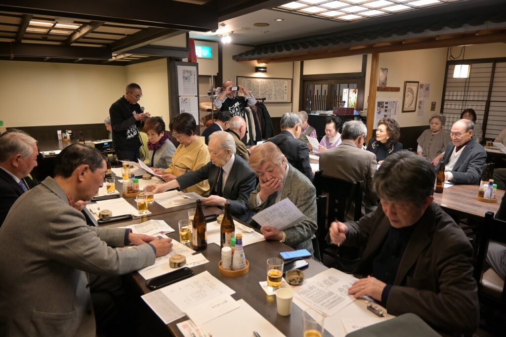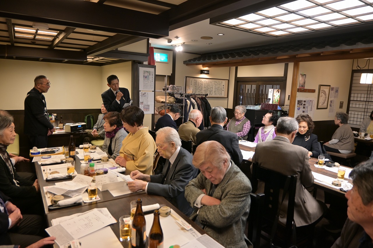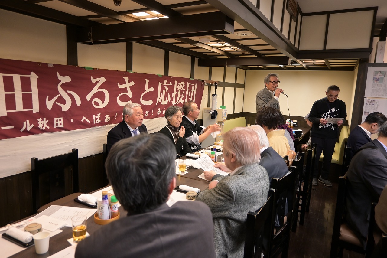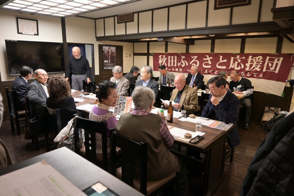 2月7日(土)12時より15時30分まで、「佐藤養助 日比谷店」において、秋田ふるさと応援団新年会が29名の参加を得て開催されました。 開会にあたり、故・内館牧子氏を偲び参加者一同で黙祷を捧げました。 保坂悟氏(中央高校)の発声により乾杯を行った後、民謡歌手の山形俊男氏、池上朝子氏、矢作トモ子氏、渚まゆみ氏よりそれぞれの持ち歌をご披露いただきました。さらに、山口敦子氏よりご提供いただいた米焼酎を秋田の銘酒とともに味わい、歓談は大いに盛り上がりました。 宴もたけなわとなった頃、大渕応援団長(能代工)より声高らかにエールが送られました。結びに、長岡功氏(能代西)より「9月5日の『スポーツ・文化・秋田応援の集い』成功に向けて頑張ろう」との力強いご挨拶があり、閉会いたしました。