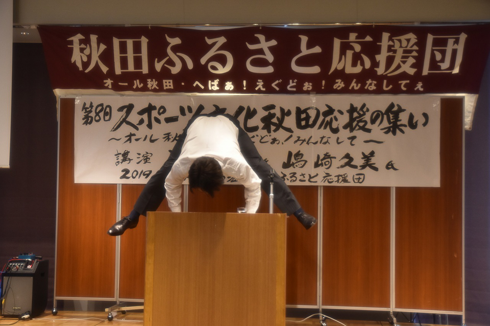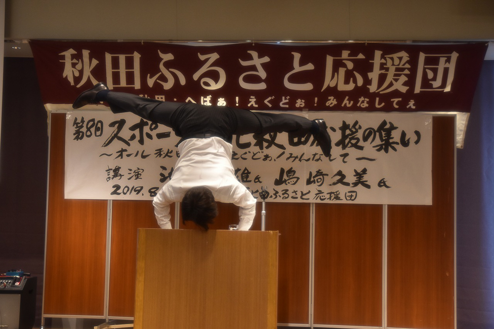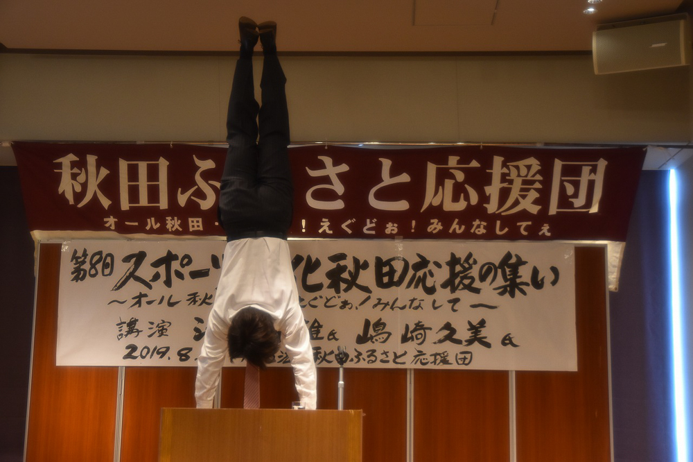 健康についての話題として「食べること」「眠ること」「体を動かすこと」の三原則が大切と語り、一つずつ具体的に実践することについて話されました。最後に演台で逆立ちを披露し会場から驚きの拍手がわきました。