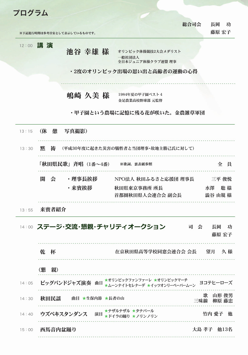 フィナーレでは、全員で「ふるさと」と「秋田ふるさと応援団団歌」を歌いました。大渕 清一応援団長 による「フレーフレー秋田」、鈴木 猛 副理事長からチャリテイの一部報告と参加者へのお礼が述べられ、お開きとなりました。