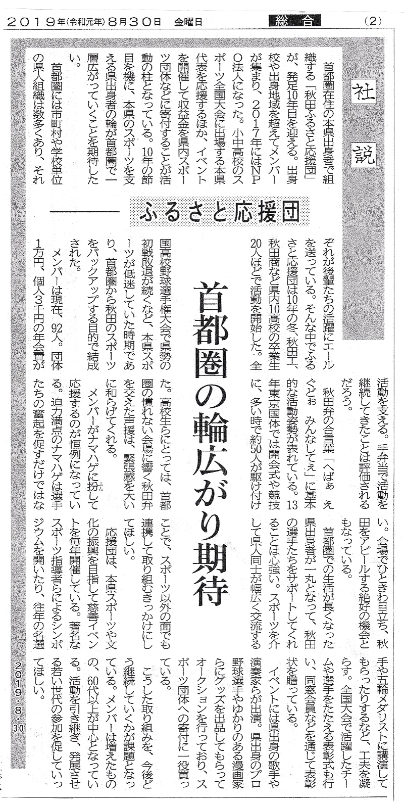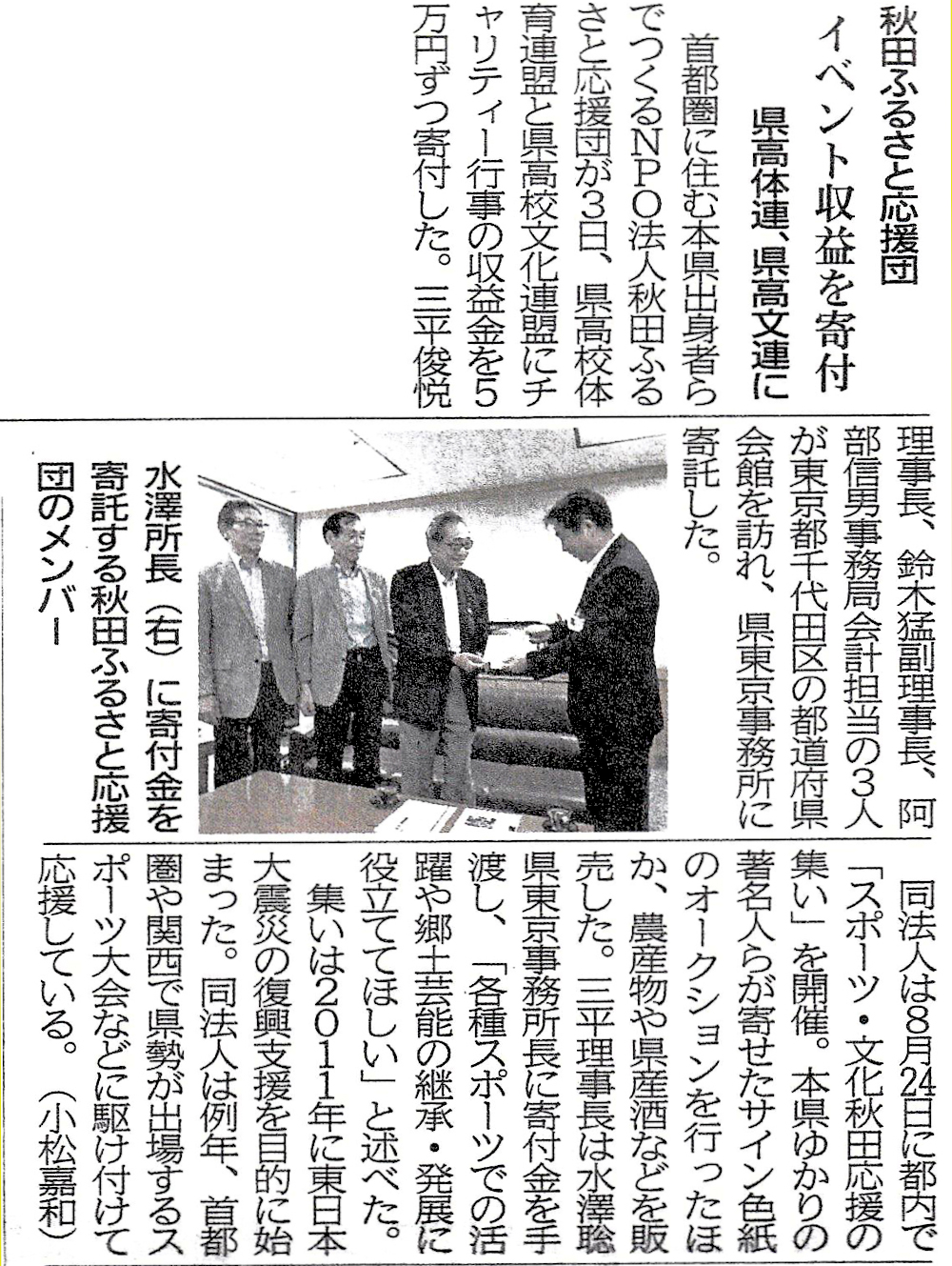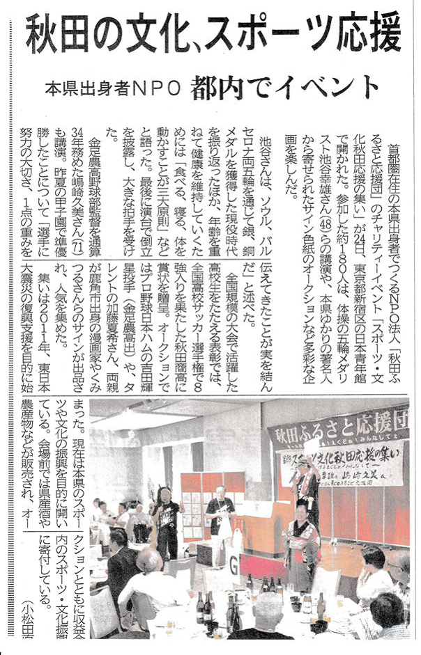 秋田魁新報8月25日の記事でチャリティが写真入りで紹介され、8月30日の社説では、ふるさと応援団「首都圏の輪広がり期待」の見出しで取り上げられ、秋田県内でも注目されました。