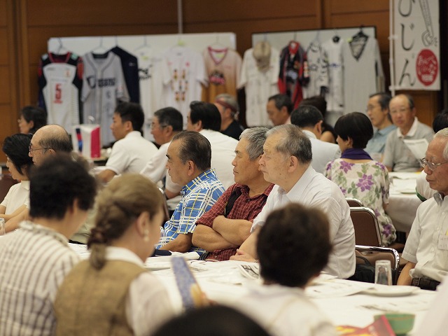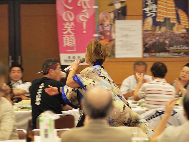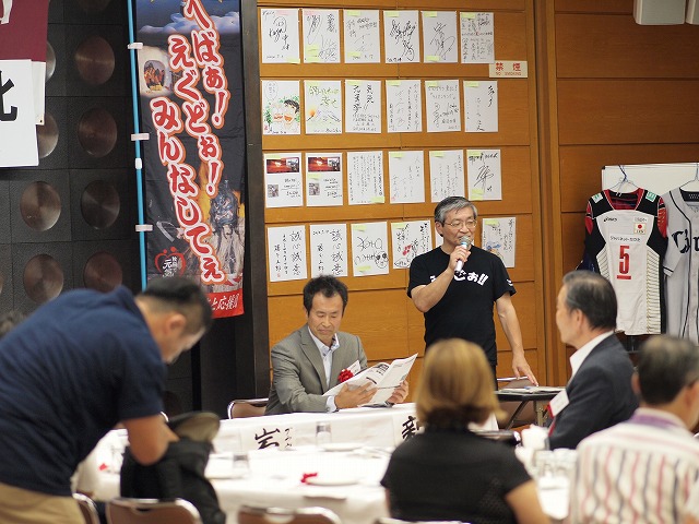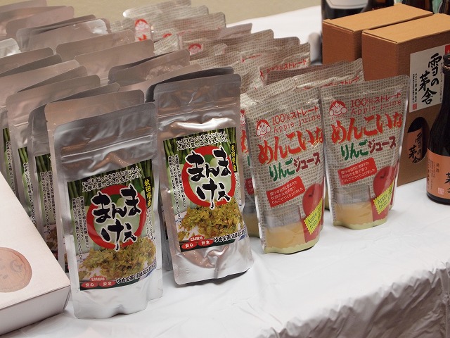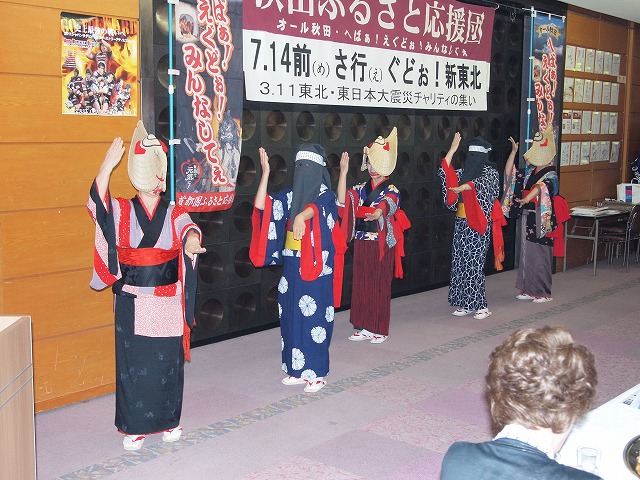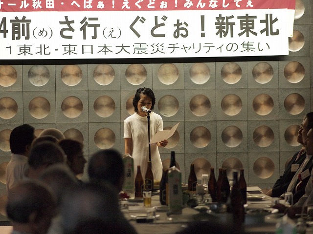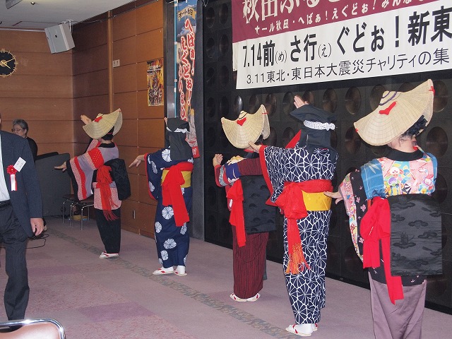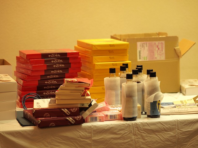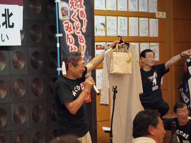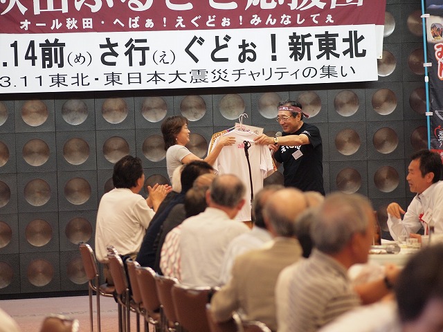 二部の懇親・交流会では、詩人 船木 倶子さんの語り、西馬音内の盆踊り、民謡ロックシンガー 佐藤真理子さんの歌に続いて、今回のチャリティに協賛していただいた秋田ゆかりの企業・著名人からの寄贈品のチャリティオークションがありました。