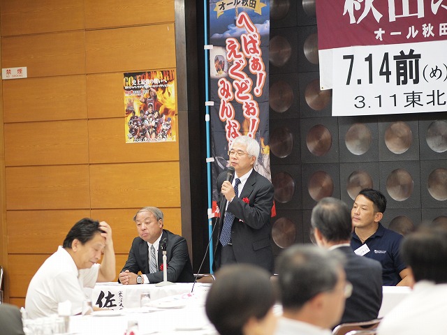 シンポジゥム「スポーツ秋田を今 ! ! 」。司会秋田ふるさと応援団 事務局長 武内暁