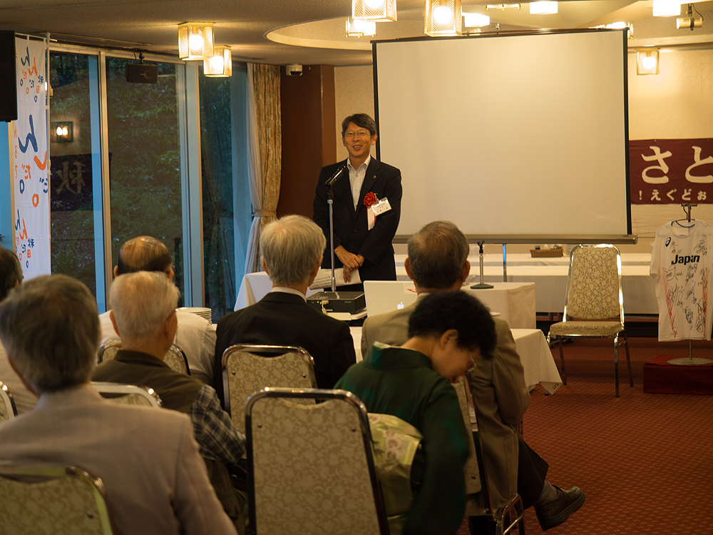 講演では、八郎潟町出身、秋田商卒、ソウルオリンピックレスリング金メダリスト、現在専修大学教授の佐藤満氏が「夢の実現~オリンピック金メダル獲得までのプロセス~」と題して、1972年ミュンヘンオリンピックで金メダルを獲得した柳田英明選手の生家が近かったこと、オリンピックへの強い思いと、レスリング強化委員長として参加したロンドンオリンピックでのエピソードなどを語りました。