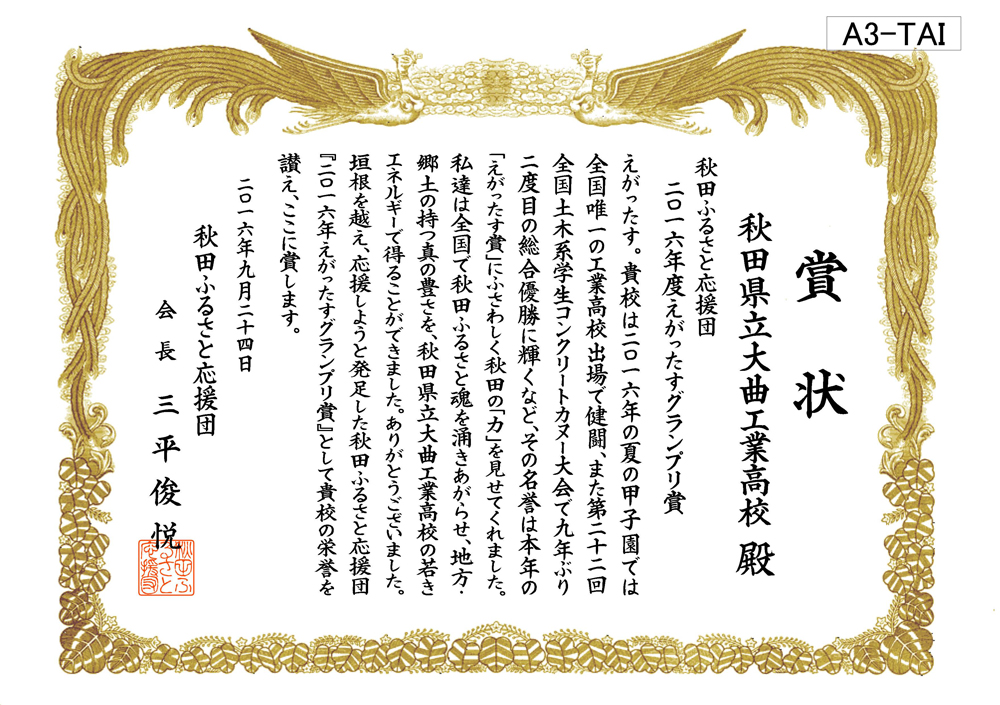 秋田ふるさと応援団が表彰する「えがったで賞」が、今年の夏甲子園で全国唯一の工業高校出場を果たした大曲工に授与されました。