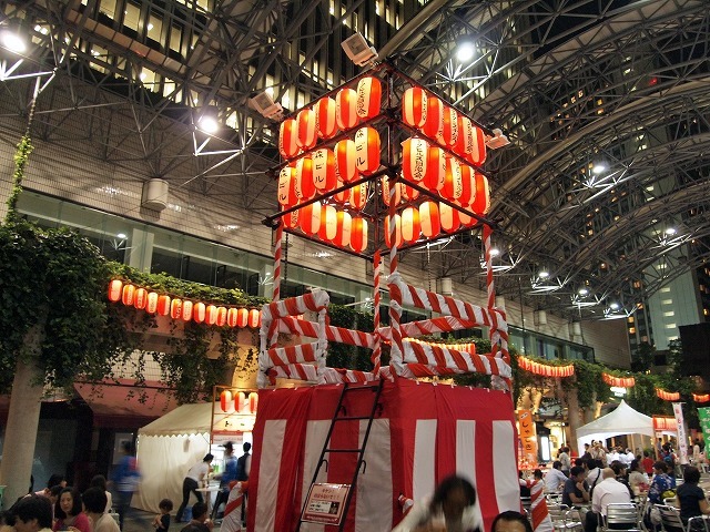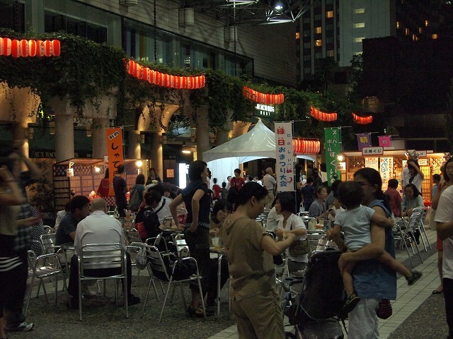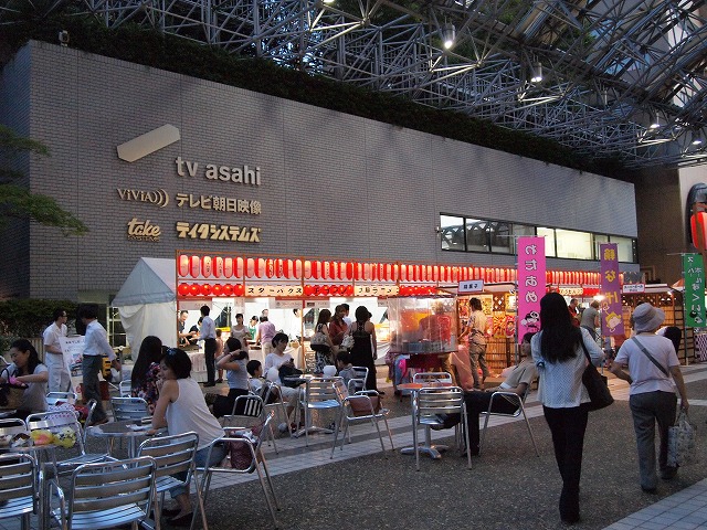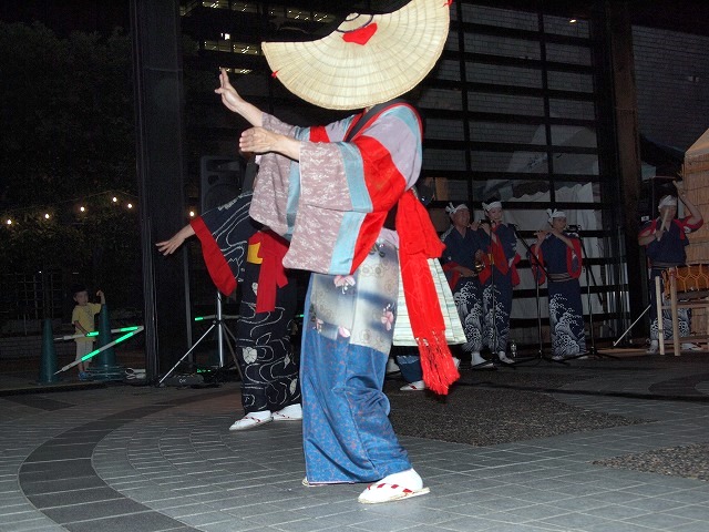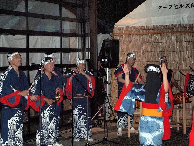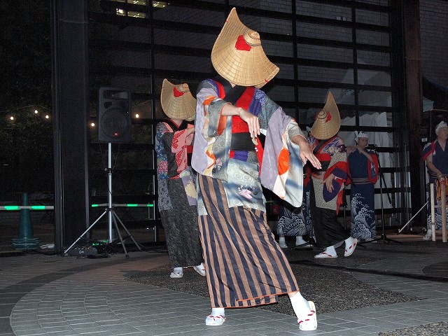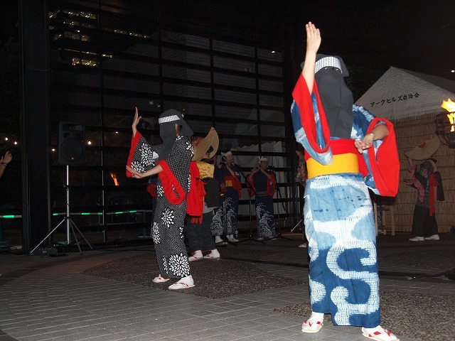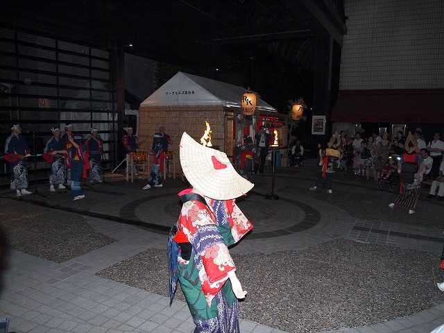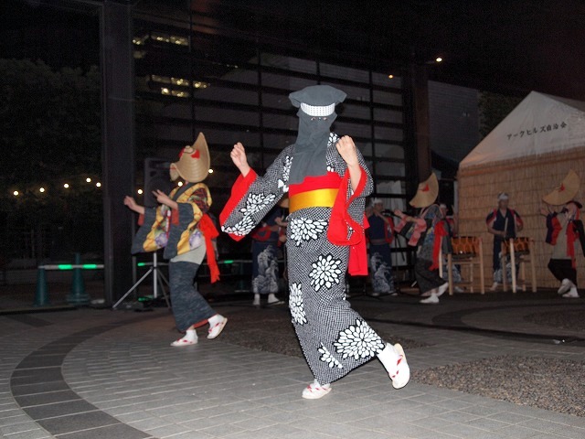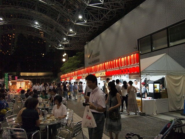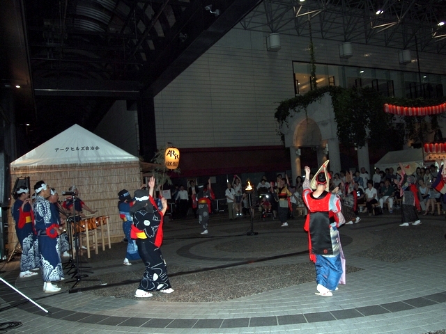 会場のアーク・カラヤン広場に設けられた縁台に席をとりヤキトリでビールを飲みながらしばし同郷の方々と語らいながら、19時からの西馬音内盆踊りを待ちました。