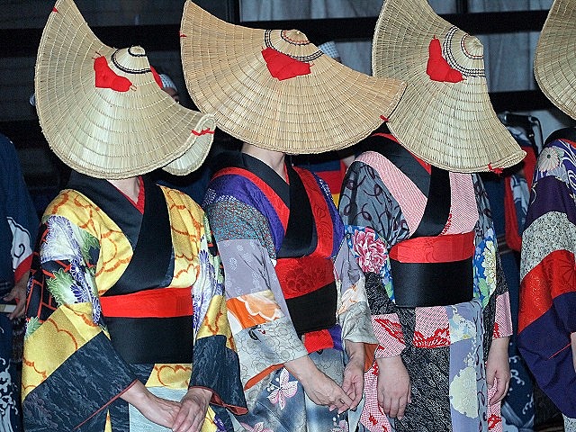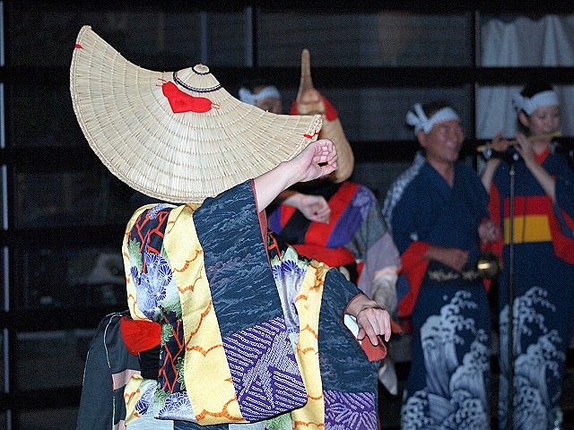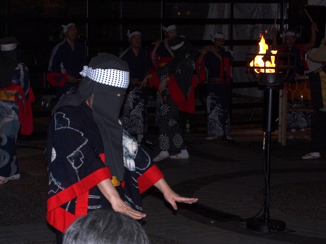 篝火(かがりび)が灯されなつかしい秋田音頭の調子に合わせて、顔を隠した女性のしなやかな踊りの一行が登場。