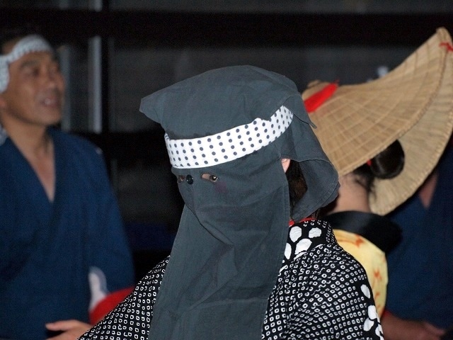 ひこさ頭巾と藍染の浴衣。袖の赤い布もこの盆踊りの特徴。