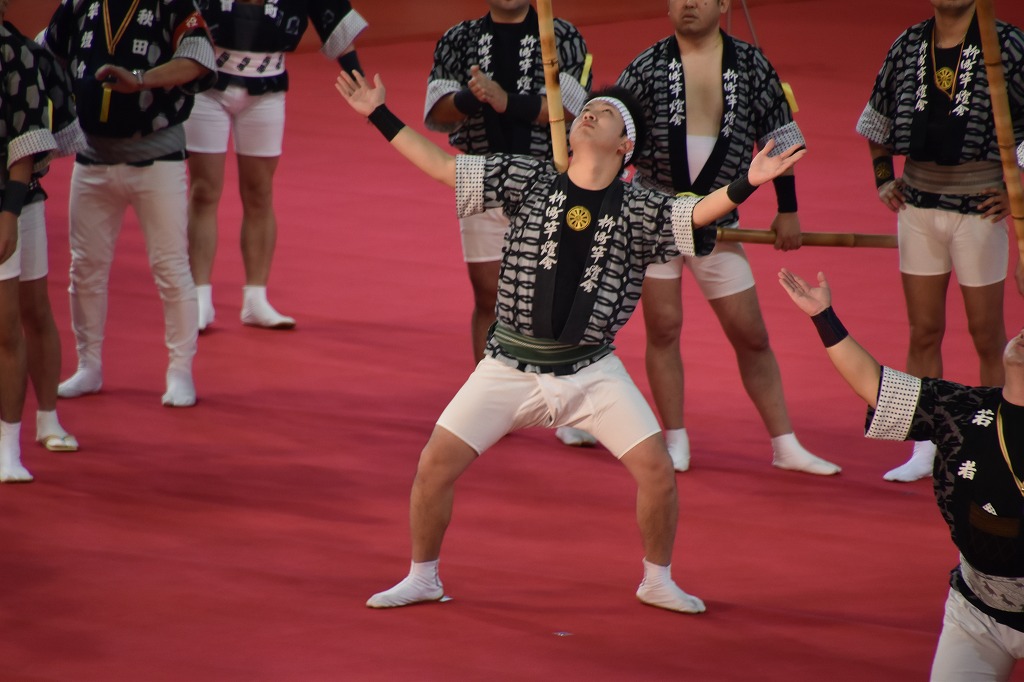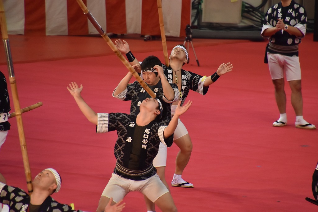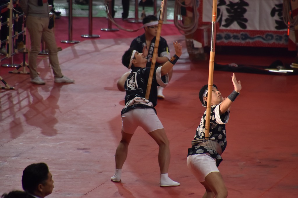 竿燈は私の町内(室町)と隣の町内(馬喰町)が実演されて、感激しました。演技は室内で風もなく継ぎ竹を何本 も継ぎ竿燈が地面と平行なるぐらい、しなっておりました。バランスをとるのが難しいが上手く演じていた。