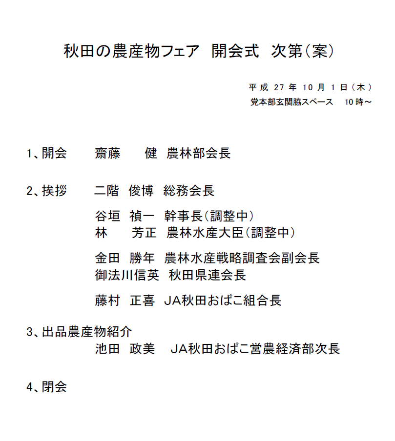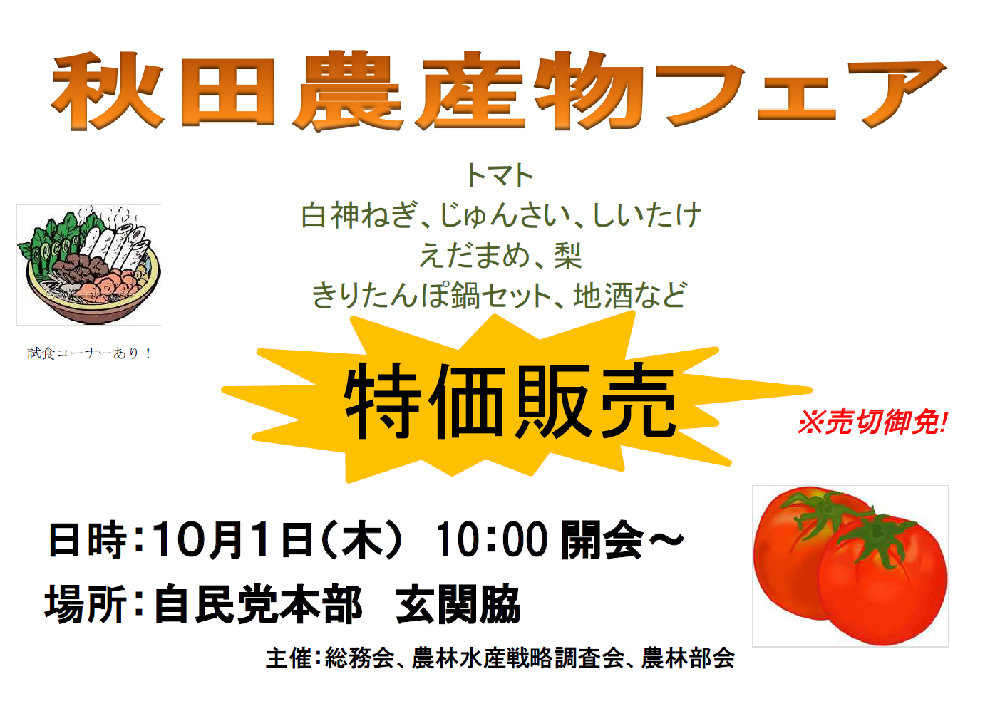 7月4日に自民党農業戦略視察団が視察した秋田県園芸メガ団地のトマトをメインに、秋田の農産物の即売会を自民党本部で下記