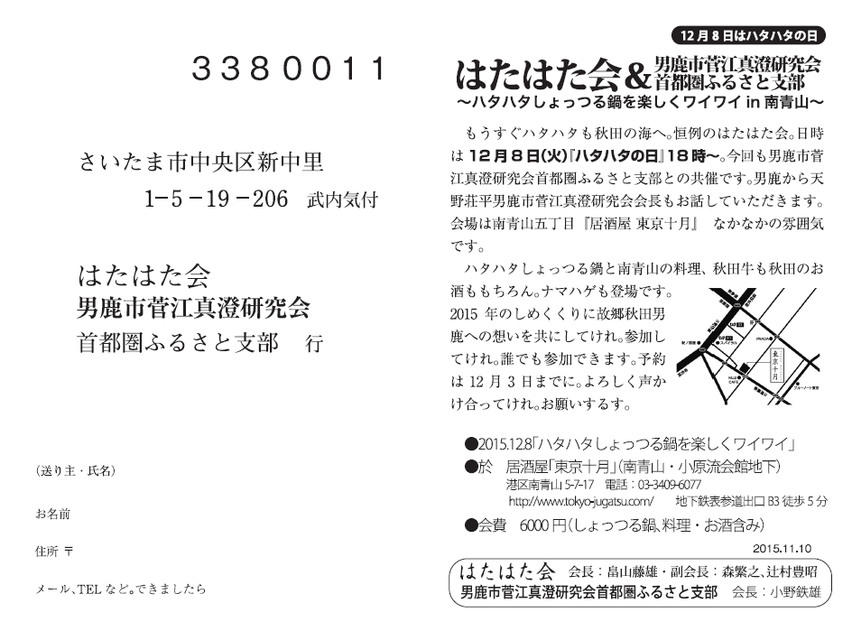 どうぞ年末お忙しい中平日夜で恐縮ですが、表参道に足を運んでください。そしてふるさと秋田・男鹿の荒波を共有したいものです。