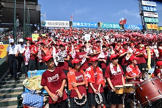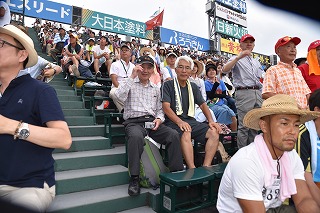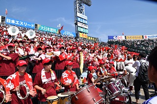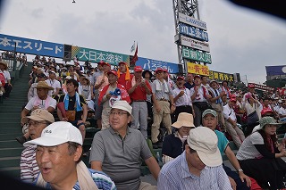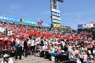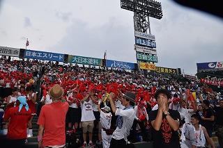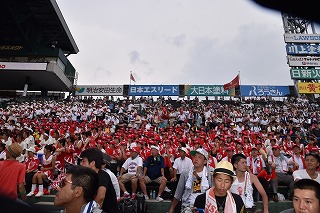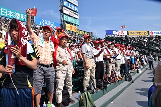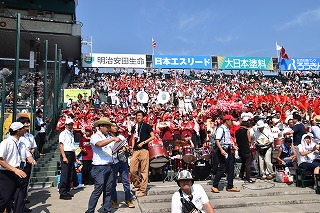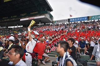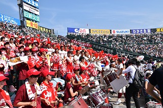三塁側アルプススタンドは秋商カラー赤色に染まり、吹奏楽部・生徒応援・OB・近畿県人会関係者で満杯となり、暑い最中一投一打に 熱狂的に応援しました。