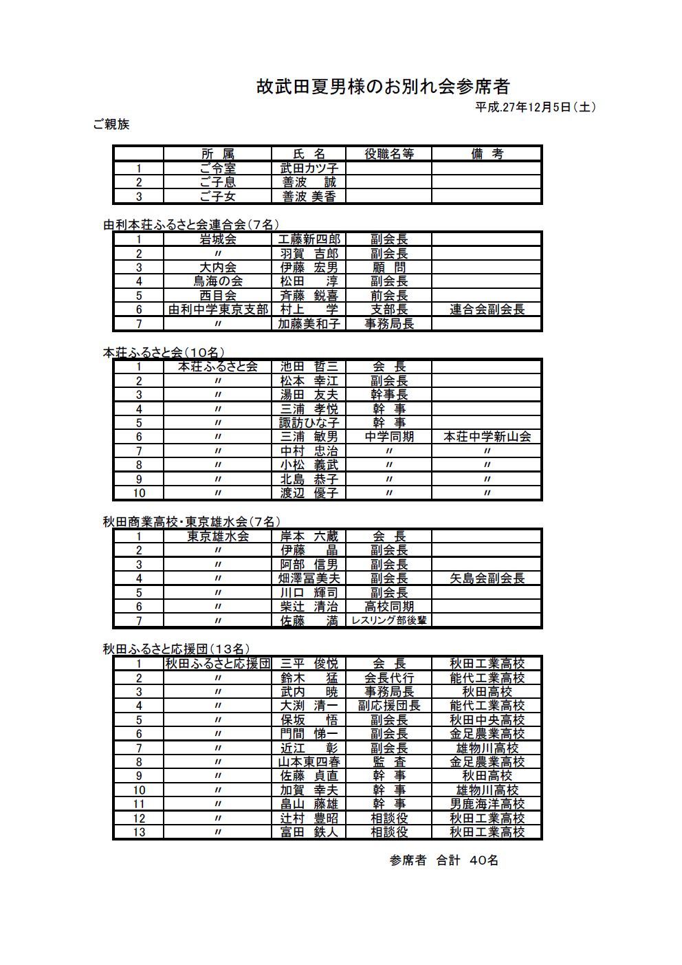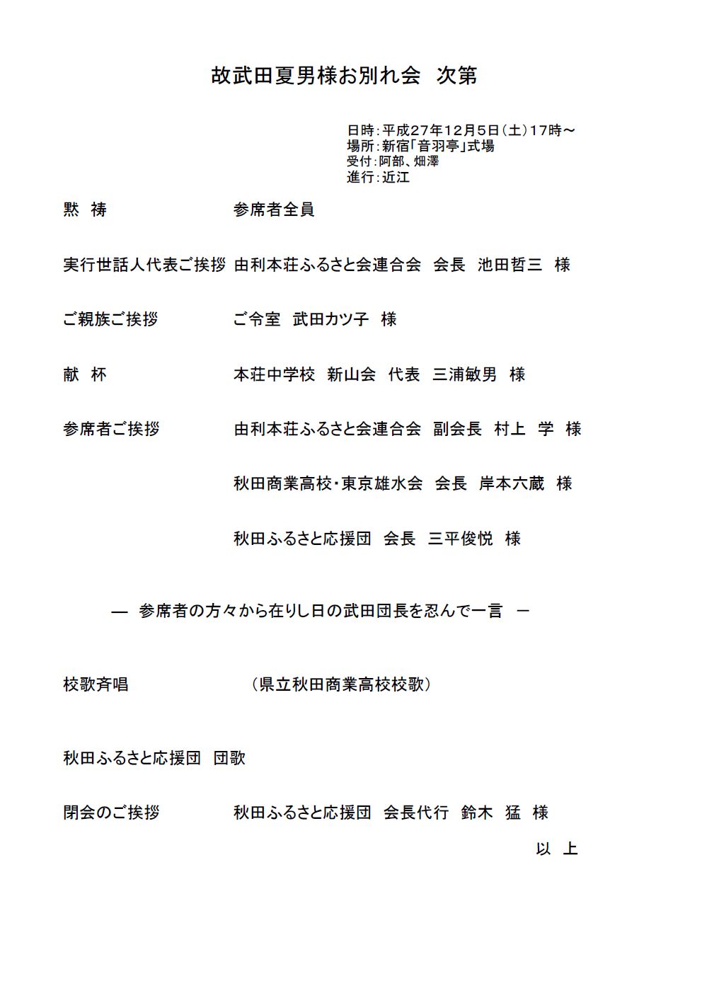 秋田ふるさと応援団団長 故武田夏男様のお別れ・偲ぶ会を、12月5日(土)午後5時より音羽亭において、 奥様の武田カツ子さん、娘さんご夫婦、由利本荘ふるさと連合会、本荘ふるさと会、中学同期生、東京雄水会、秋田ふるさと応援団など41名が参席して開催されました。