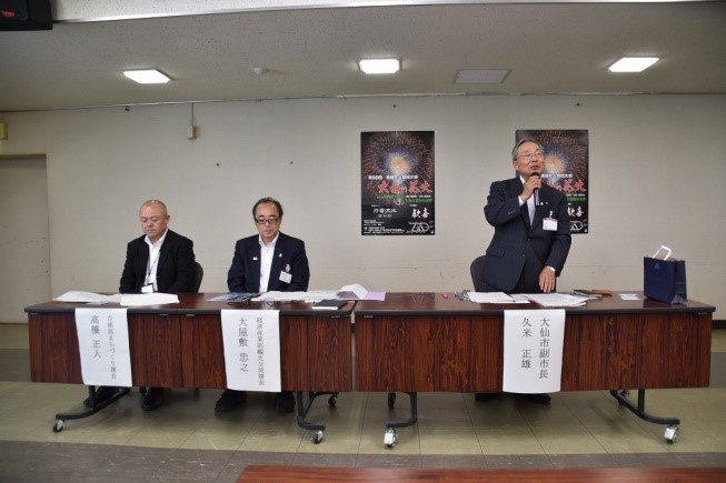 @大仙市を訪問し、久米正雄副市長から市の現状について説明していただきました。人口が毎年約1,000人減少している対応として流動人口を増やすため、四季を通しての花火大会や来年4月24〜29日には、国際花火シンポジウムを開催し、「見て来て買ってもらう」と、力強く話していました。リオオリンピックにマラソン1名・カヌー2名の大仙市出身者が出場します。応援をお願いされました。