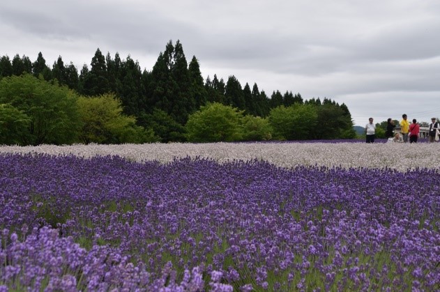 ラベンダー園では、商工観光交流課の山田主任が案内してくれました。2万株を超えるラベンダーが鮮やかに色づき満開となり、ホワイトラベンダーと紫色のラベンダーのコントラストが鮮やかで、甘い香りが漂っていました。ホワイトラベンダーは「美郷雪華」と名付けられ美郷町ラベンダー園で発見された品種です。商工課より全員に「ニテコサイダー」をお土産にいただきました。真昼岳が雲に隠れてラベンダーとのコラボ写真が撮れなくて残念でした。