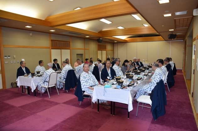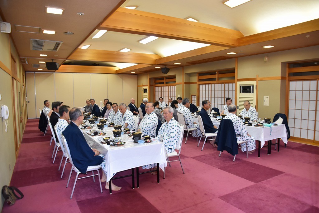 G花葉館に宿泊。温泉に浸り疲れを癒して、7時から宴会を始めて岸本会長(秋商)の挨拶、中山文夫さん(角館高)の乾杯で懇親会に入りました。全員からのスピーチと酒を飲み放題、カラオケなどで大いに盛り上がり各校の交流と親睦が深まりました。