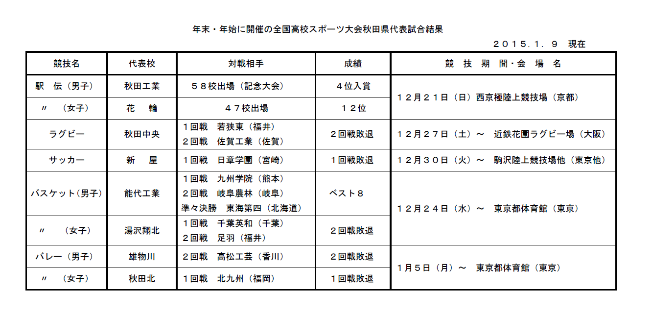 駅伝男子の秋田工業4位、女子花輪高校12位、バスケット男子の能代工業ベスト8など期待に応えていただきました。