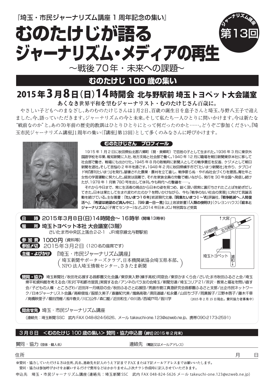 1周年を迎える毎月の埼玉市民ジャーナリズム講座が呼びかけ主体となり、地元埼玉新聞、その他新聞社関係、JCJ関係、ふるさと秋田の秋田文化会議や横手高校同窓会、かまくら会、そして埼玉のさまざまな市民団体や個人のみなさんでこの集いをつくりたいと思います。10日の1月ジャーナリズム講座で確認いたしました。