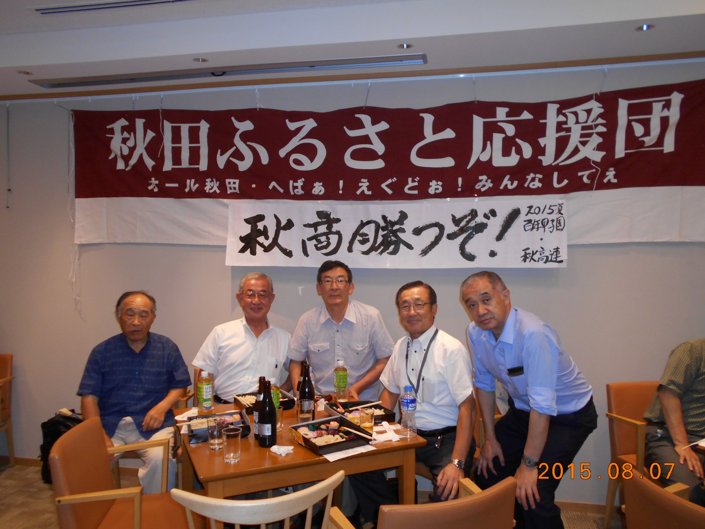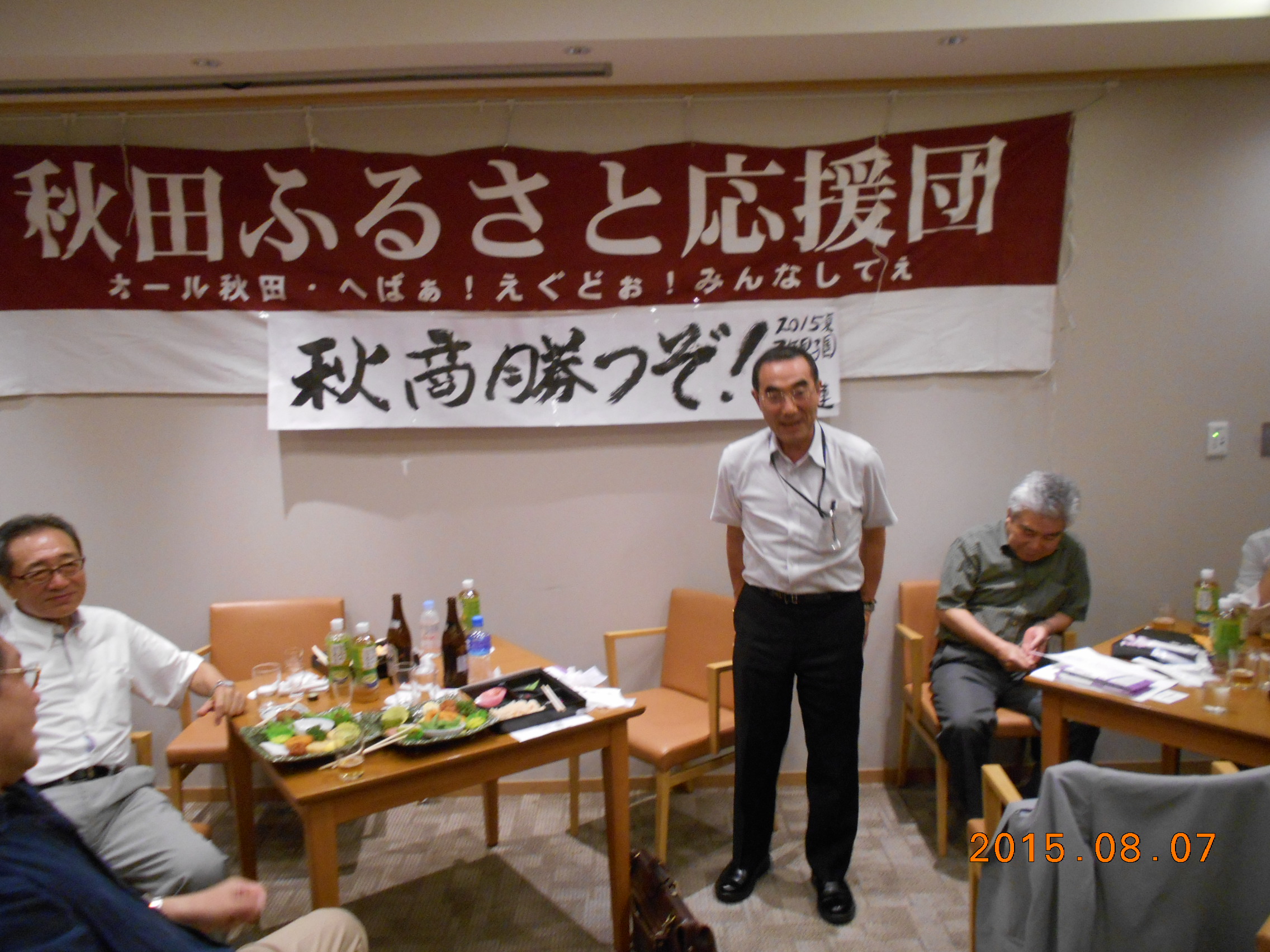 今年が創設100年の節目を迎えた高校球児の聖地「甲子園」、その記念の年に出場する秋田商を、県内高校出身者で構成する「秋高連」の役員と、ふるさと秋田のスポーツ・文化を応援する「秋田ふるさと応援団」が 2015年8月7日(金)18:30〜東京飯田橋 の東京理科大学・理窓倶楽部に約40名が集まり、 「先ずは一勝・ガンバレAKISHO 」と激励会を開いていただきました。
