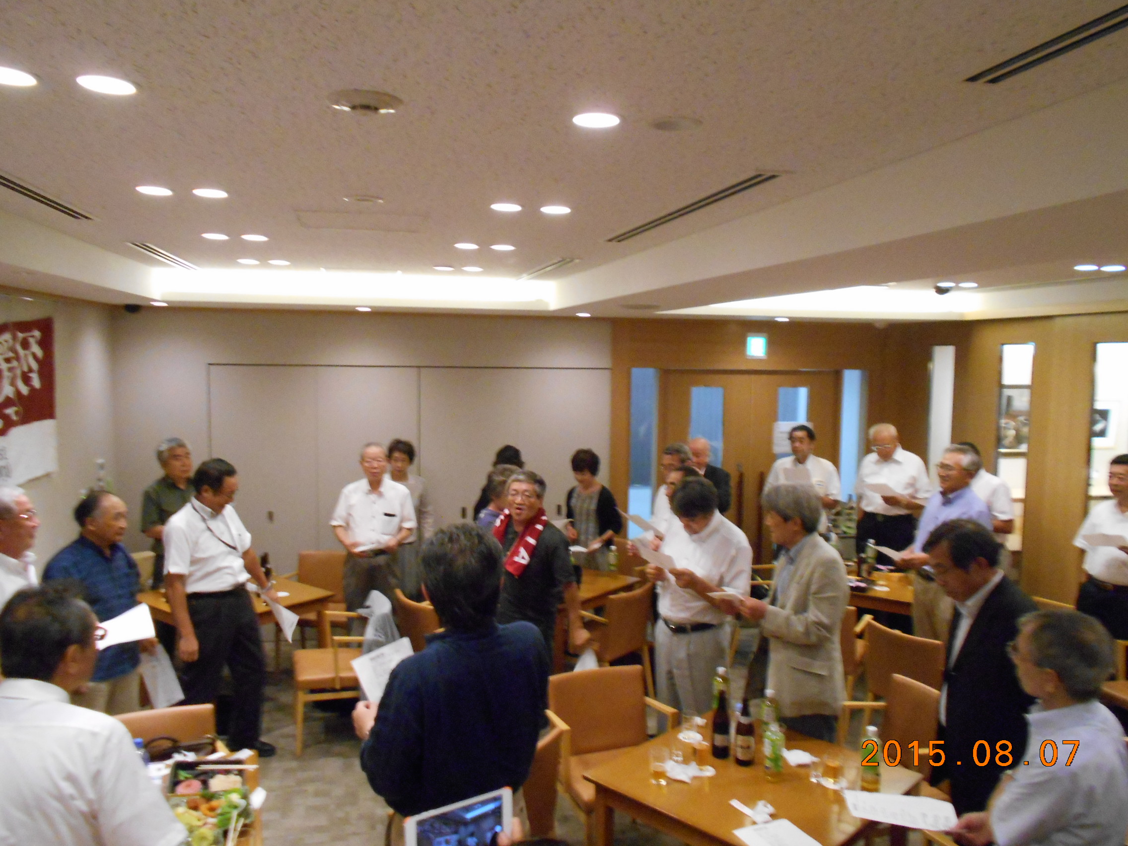 参加者一同県民歌のスタートとともに、協賛、出品、などご協力頂いた企業や各界人の皆さんとの140人の大合流です。