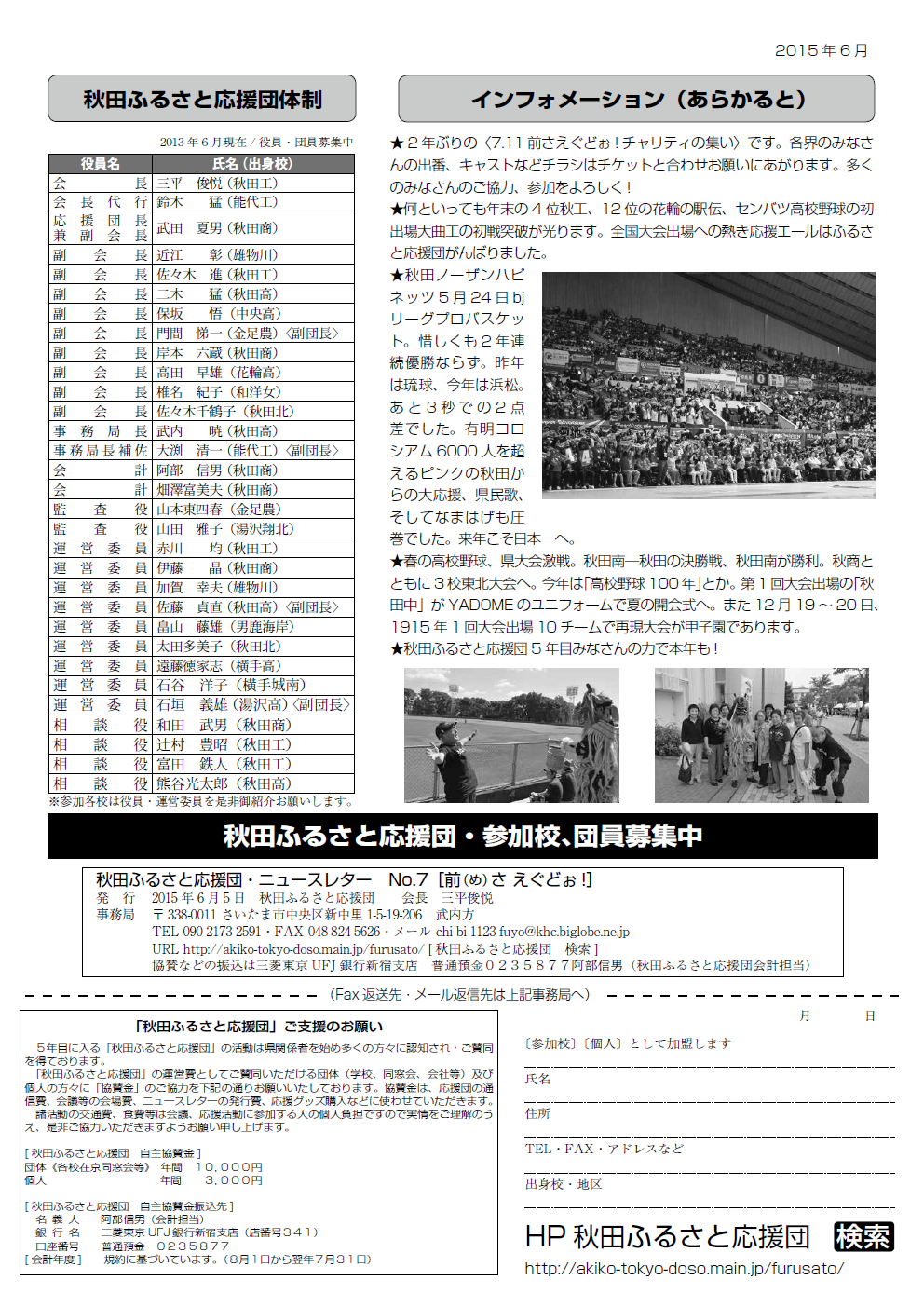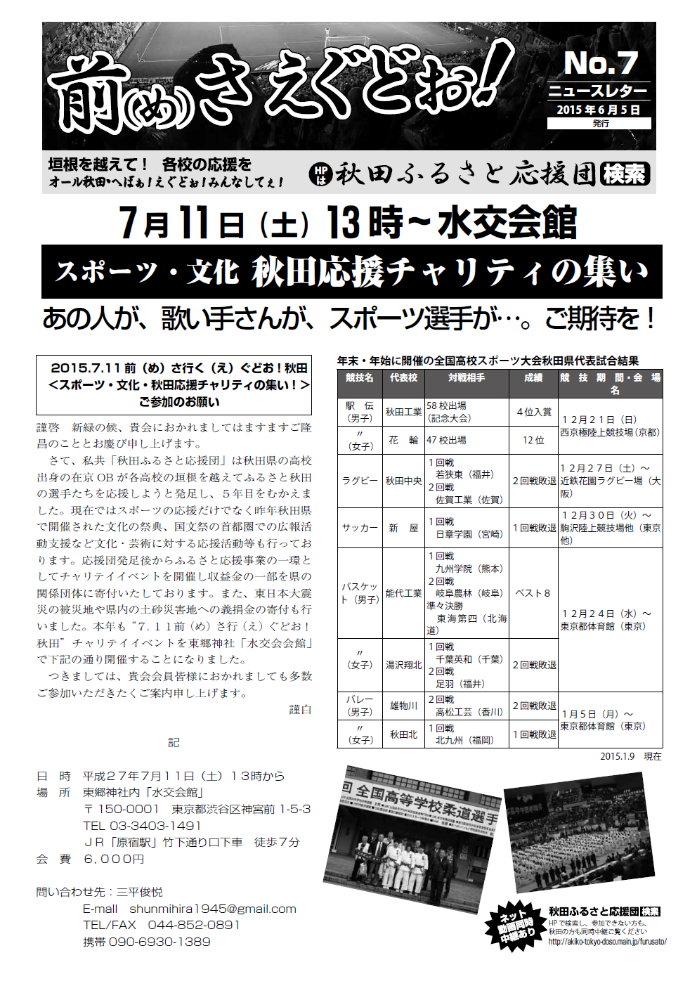 7月11日(土)午後1時原宿・水交会館です。オール秋田みんなでワイワイです。今年は戦後70年・私たちの秋田は……も文化・スポーツ・秋田と首都圏など考えながら……。