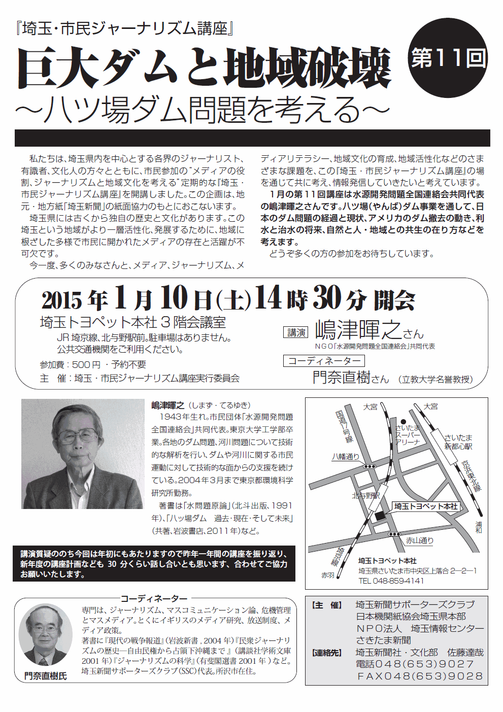 1月の埼玉市民ジャーナリズム講座の案内1月10日です。今回から2時半開会です。また昨年1年間の講座中間まとめもあります。是非ご出席お願い致します。
