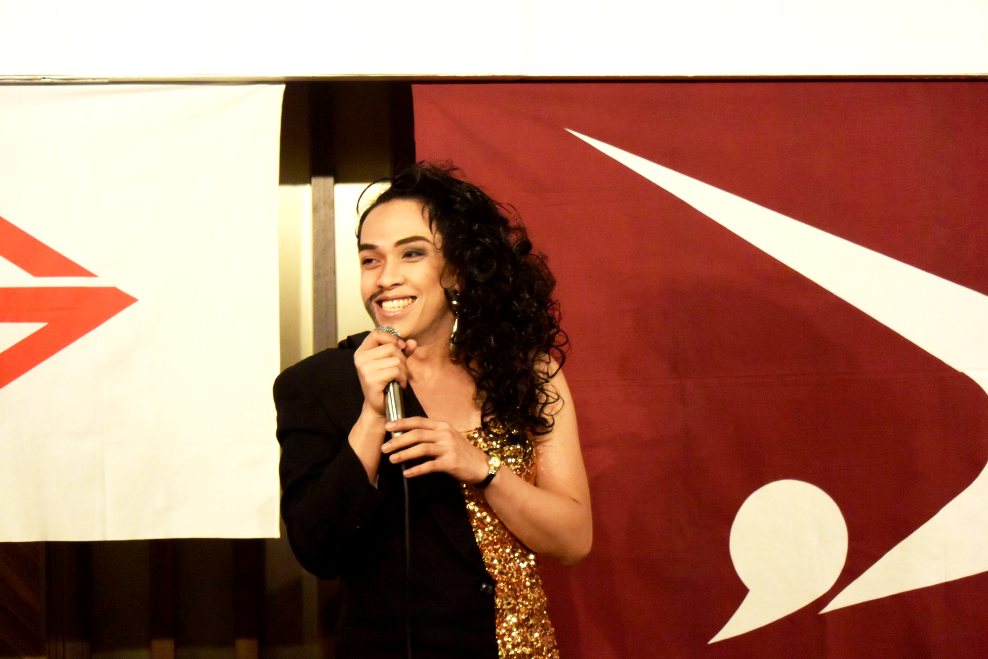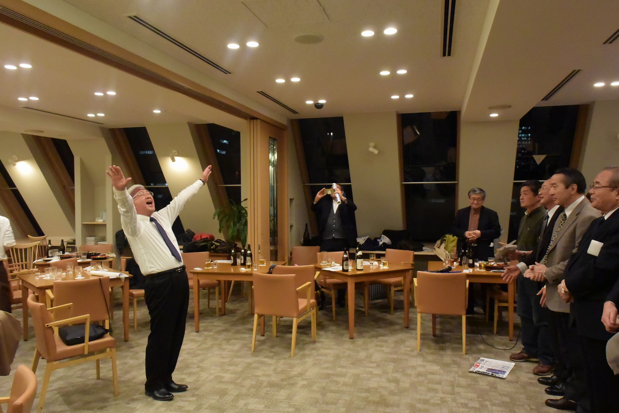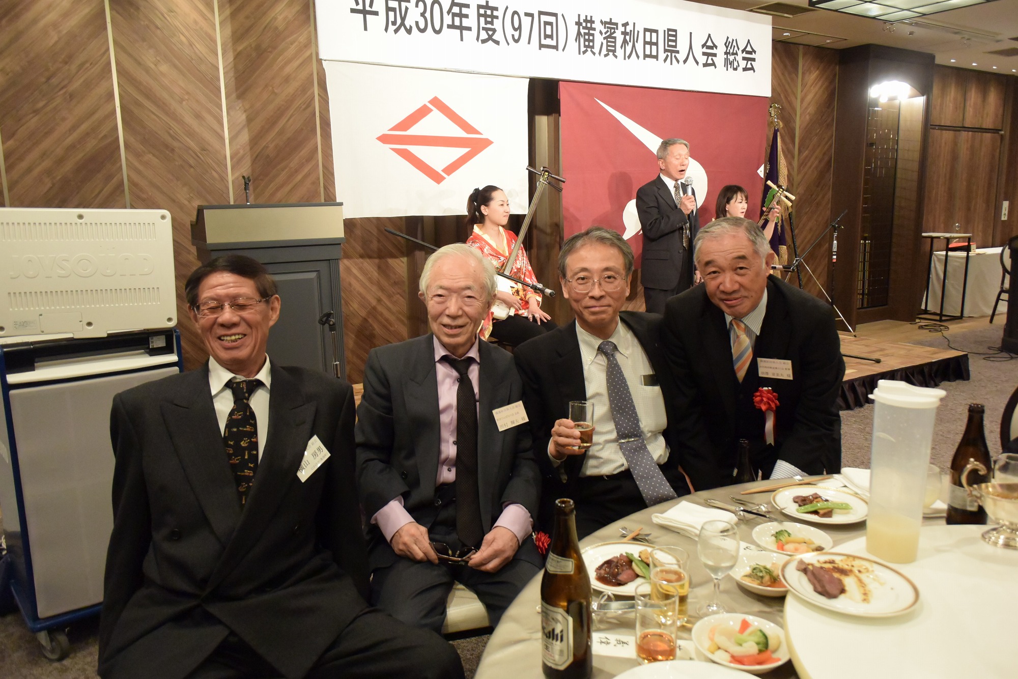 祝宴・懇談では、津軽三味線・両面(男・女)、歌手等で会場が盛り上がり、皆さんプロ並みの歌唱力でカラオケを楽しみました。山形俊男氏が「秋田おばこ・長者の山」を歌いました。