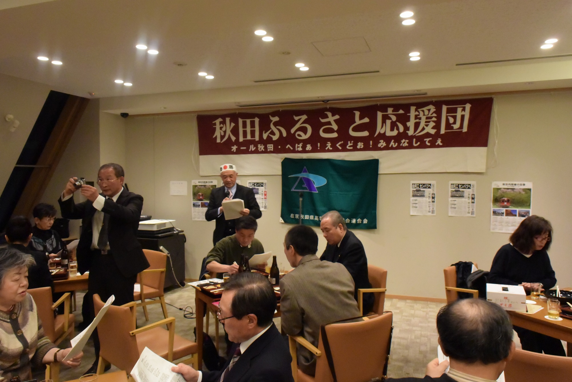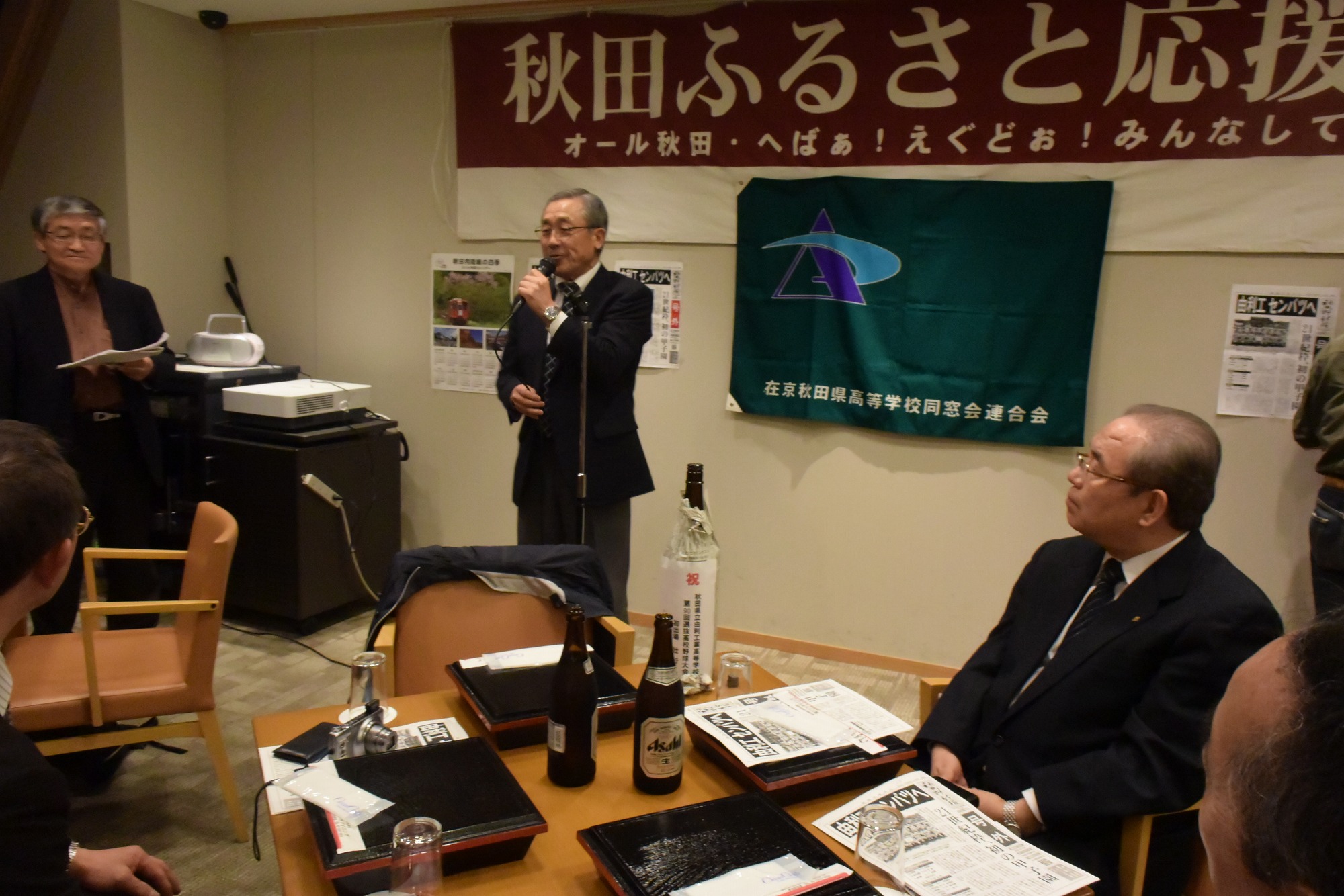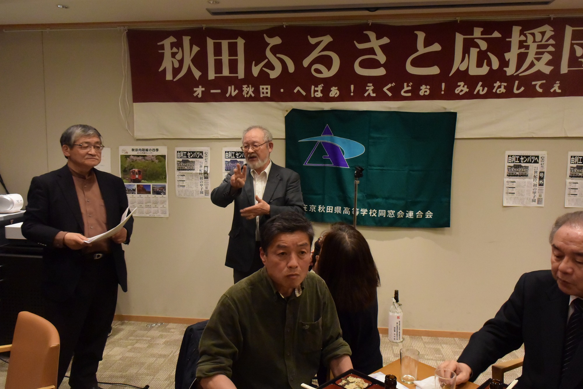 写真のとおり、会場にふるさと応援団の横断幕が飾られ、秋田魁の号外、地元由利本荘の高原鉄道のポスターが貼られるなど、また、山形俊男氏(秋田工)が秋田民謡「長者の山」で御祝いに華を添えてくれました。