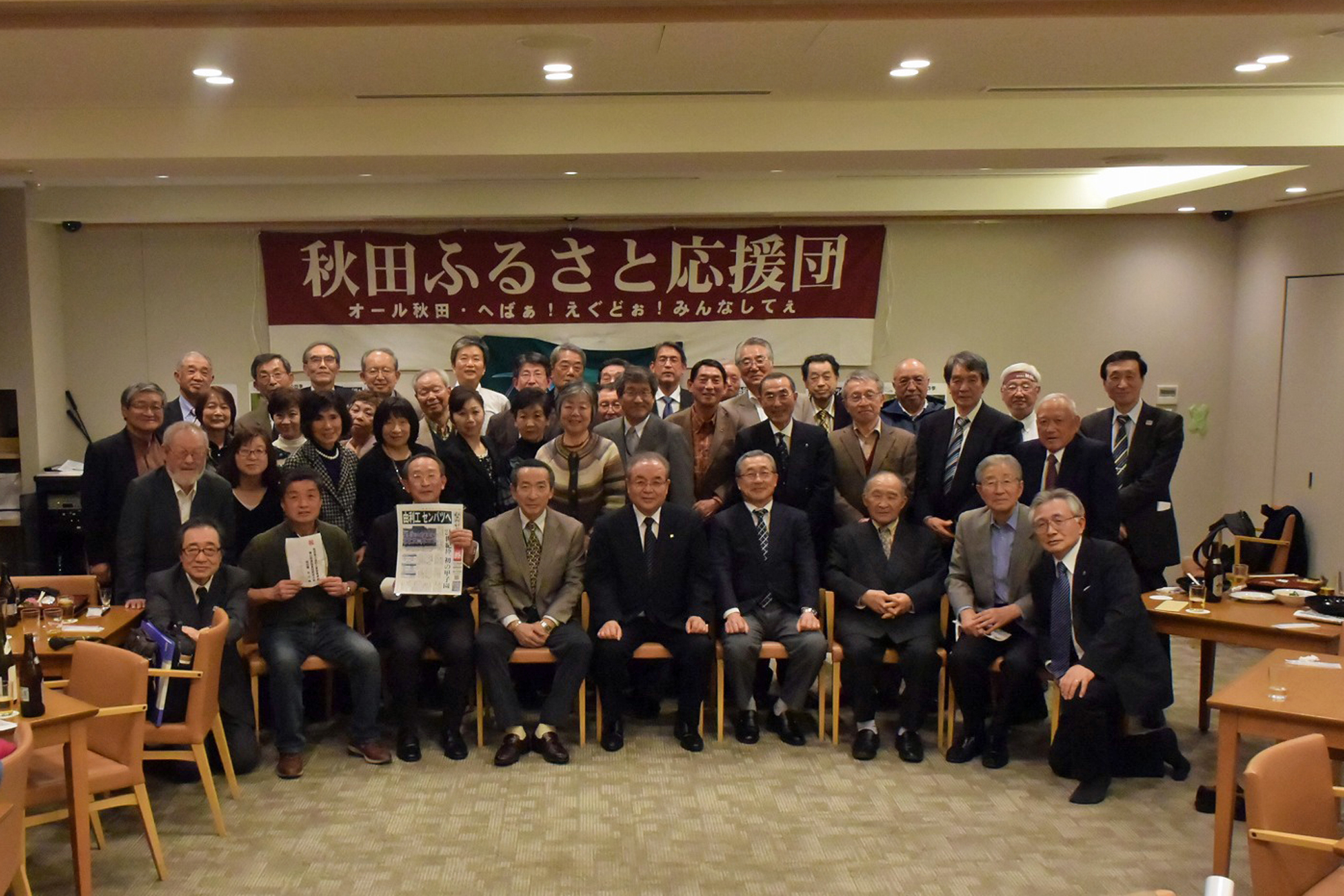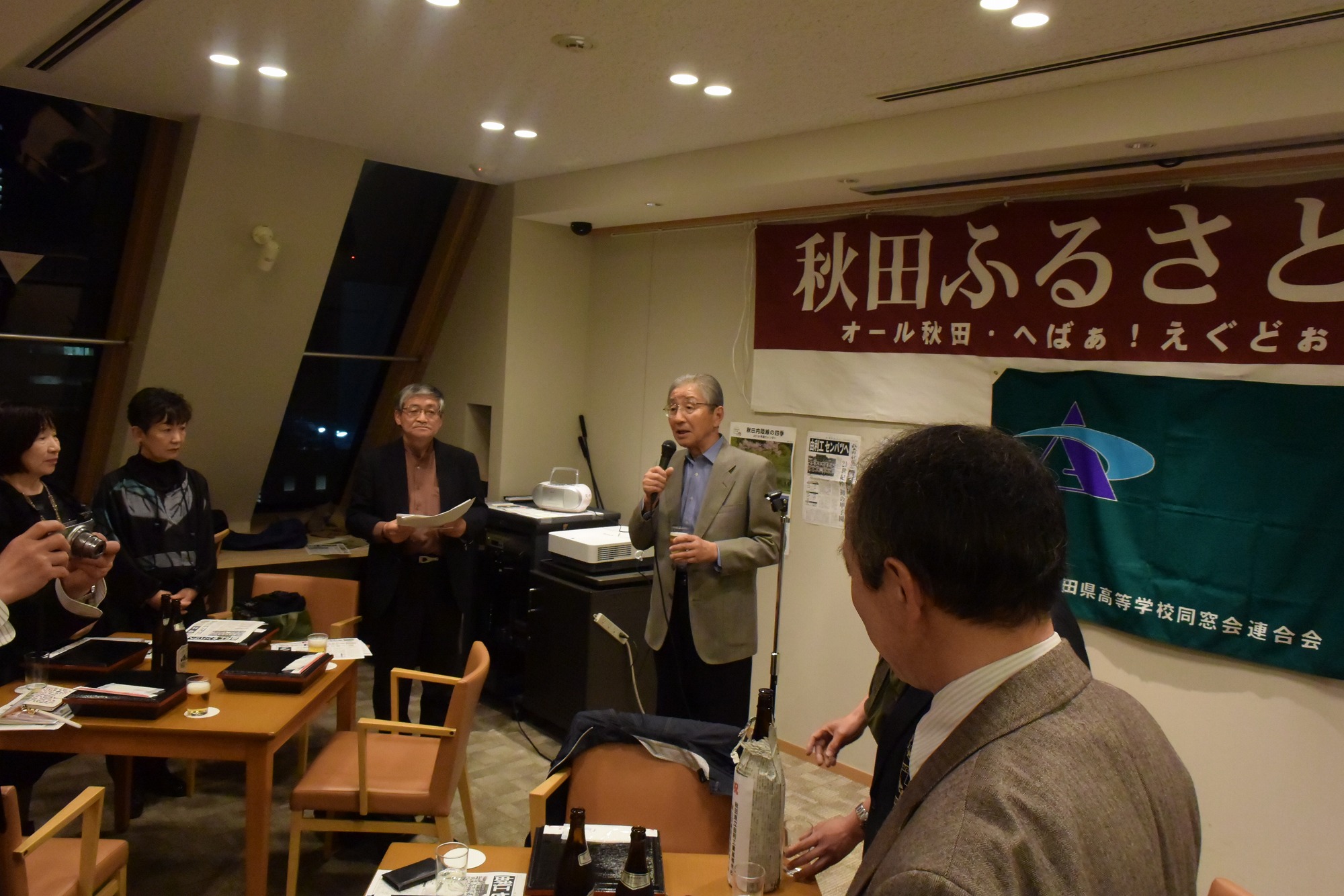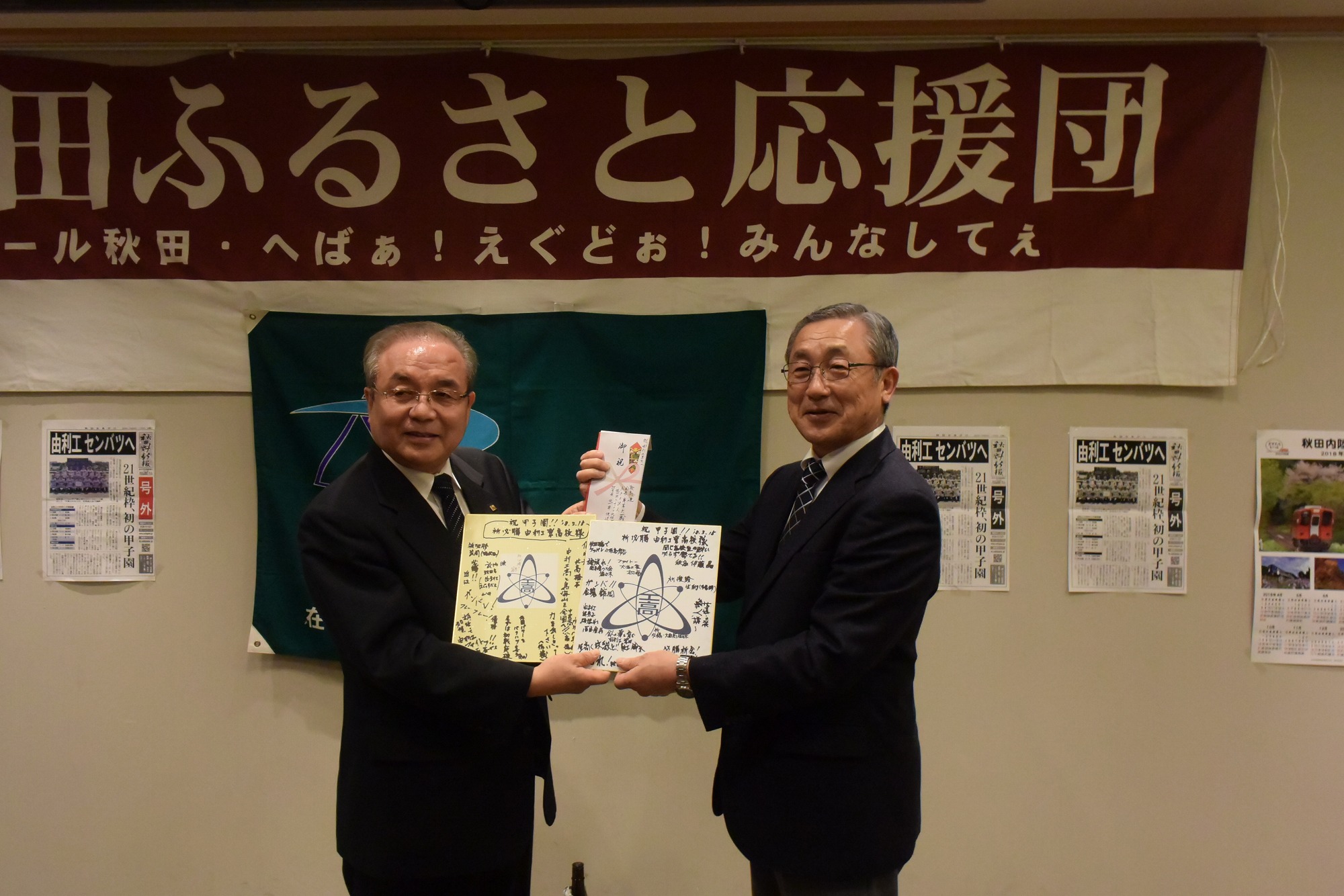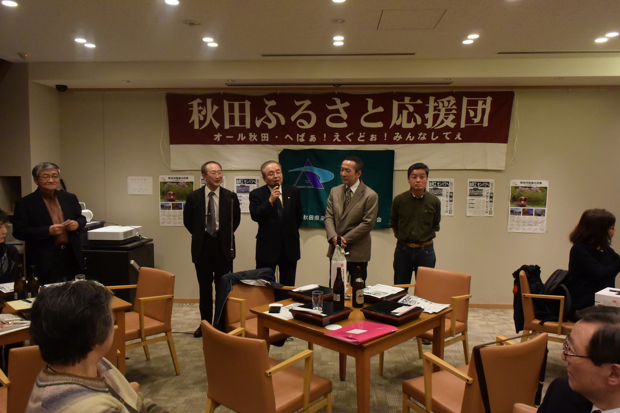 写真のとおり、会場にふるさと応援団の横断幕が飾られ、秋田魁の号外、地元由利本荘の高原鉄道のポスターが貼られるなど、また、山形俊男氏(秋田工)が秋田民謡「長者の山」で御祝いに華を添えてくれました。
