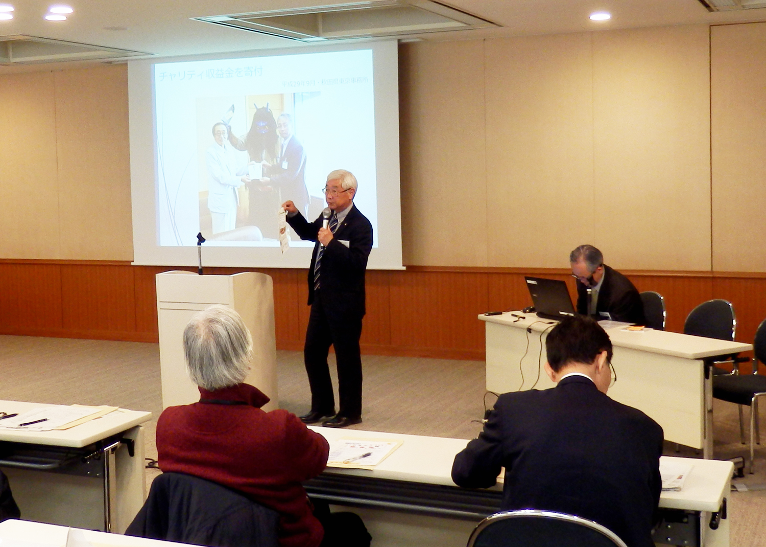 会議終了後、場所を同会館倶楽部に移し、出席者40名余で弁当を囲みながら壮行会を行い、3月23日から始まる甲子園第90回記念選抜高等学校野球大会に21世紀枠で出場を果たした秋田県立由利工業高校にエールを送るとともに、岸本秋高連会長から由利工東京同窓会(桃源会)の畑山会長にカンパで寄せられた活動資金が贈呈されました。