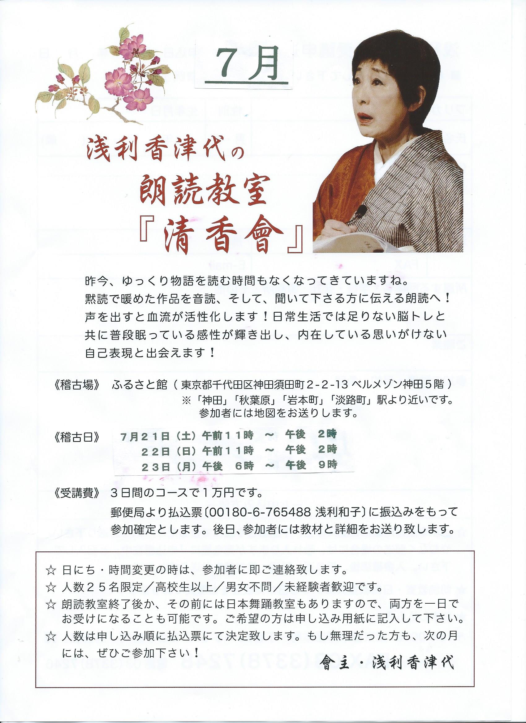 秋田ふるさと応援団がチラシ配布を担って、出席者の増員に一役買っております浅利香津代の朗読教室が5月20日、21日、22日の3日間、 神田のおーる秋田 東京ふるさと館で開かれました。