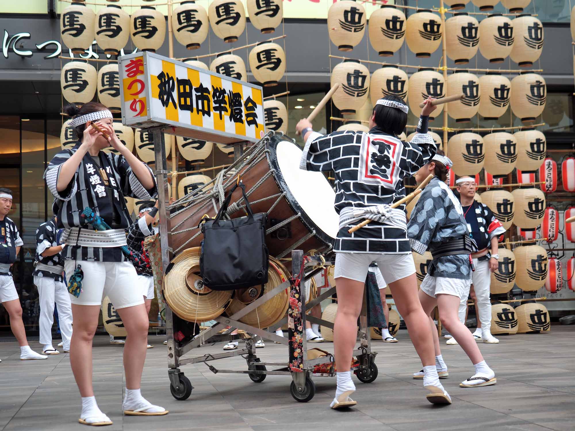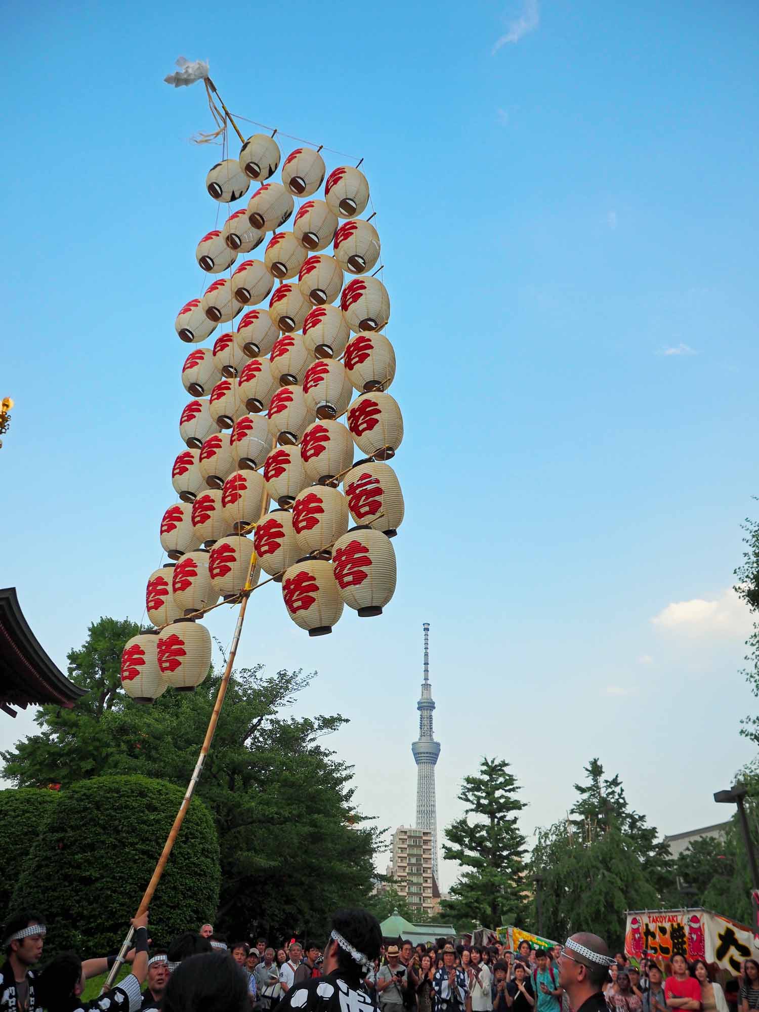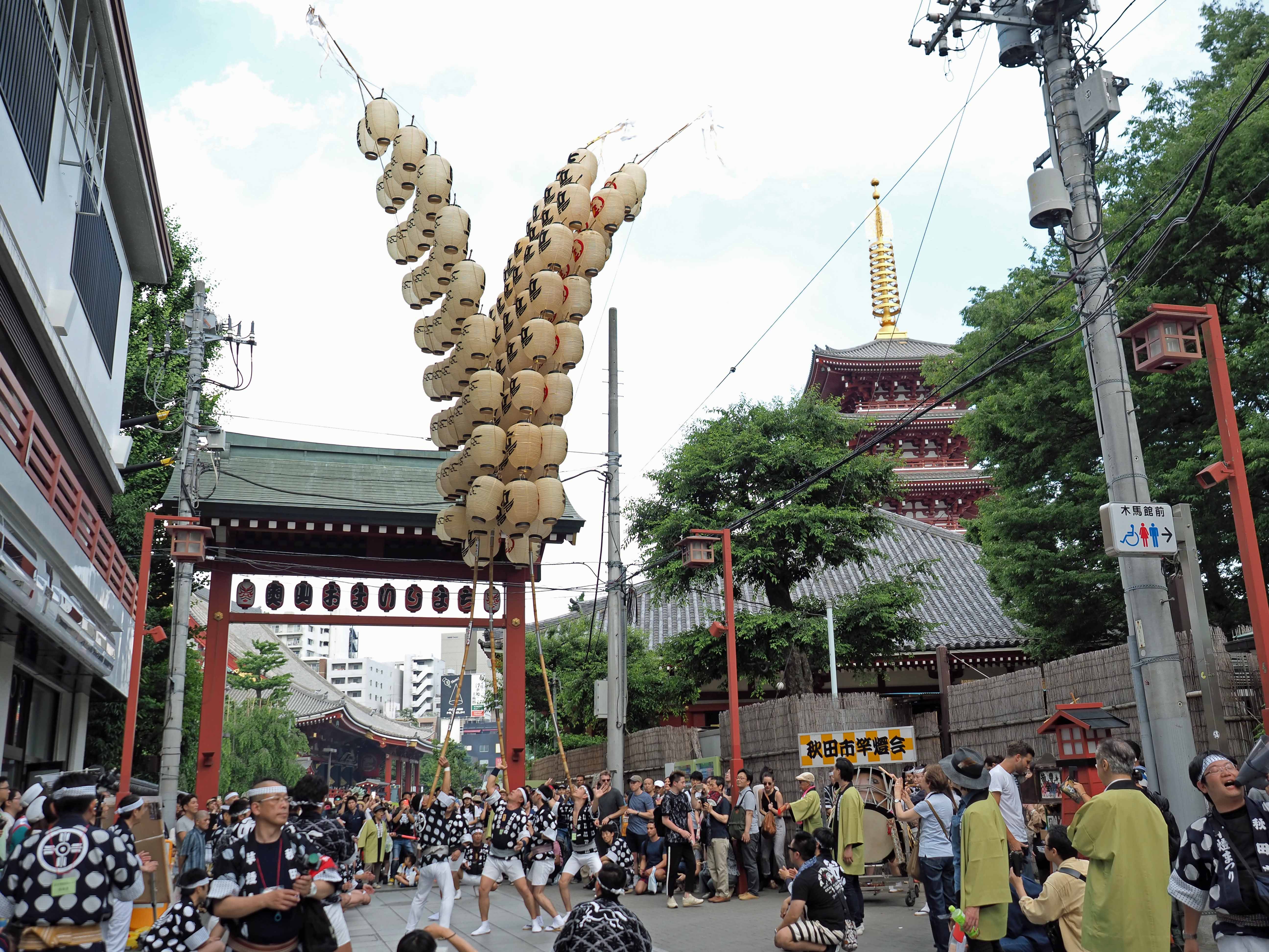 8月3日から6日まで秋田市で開催される竿燈祭りをPRする浅草での竿燈まつり。今年で9回目の開催となった。浅草寺周辺の商店街で昼3箇所夜1箇所に3本の竿燈が登場。