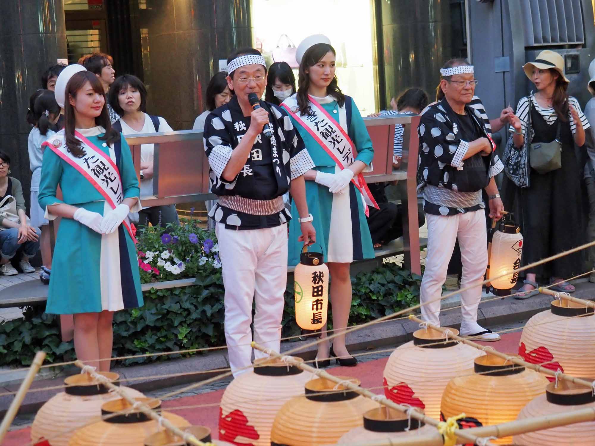 穂積秋田市長「秋田の本番では竿燈280本と1万個の提灯が登場、是非秋田に来てください」とPR