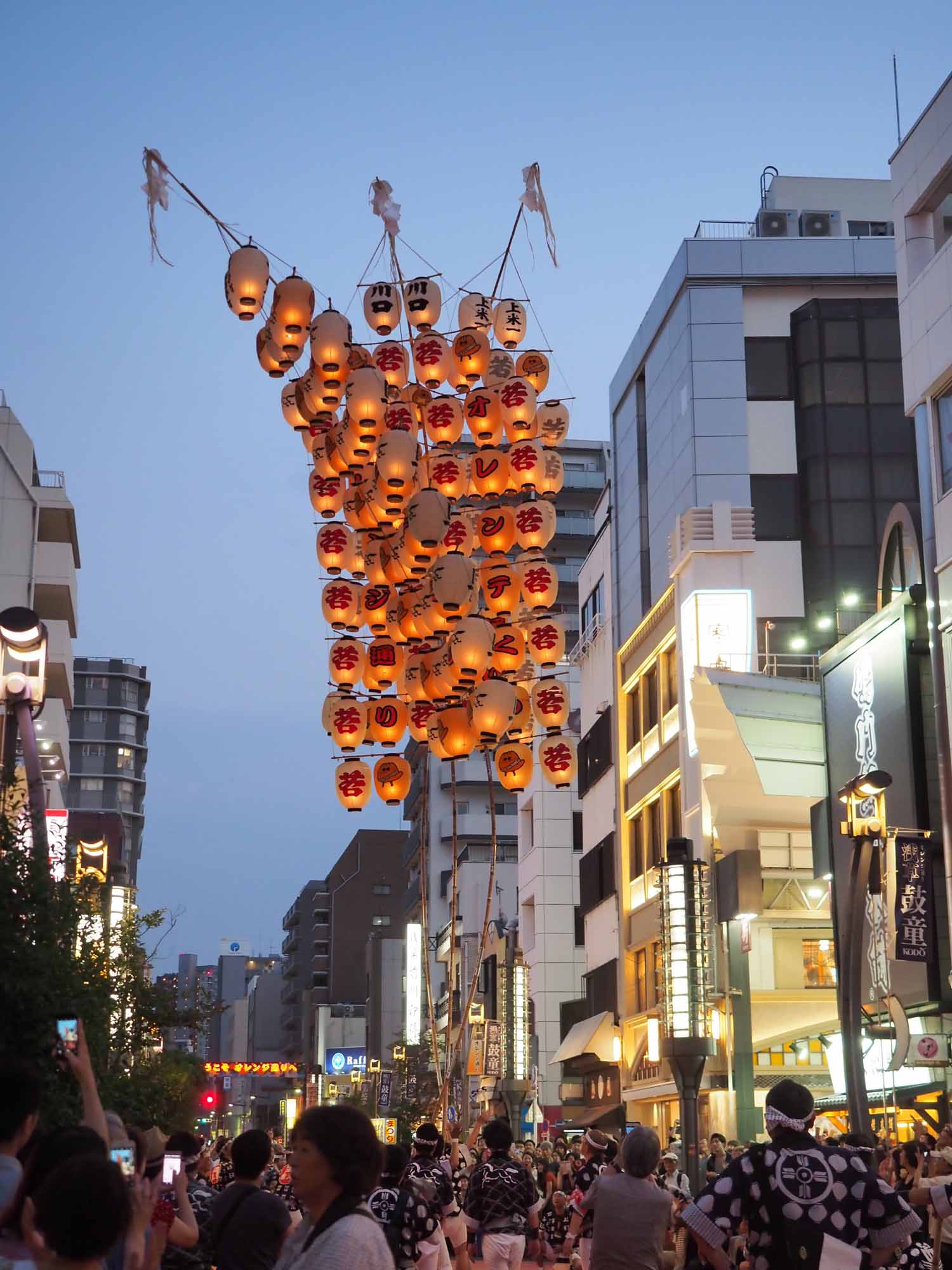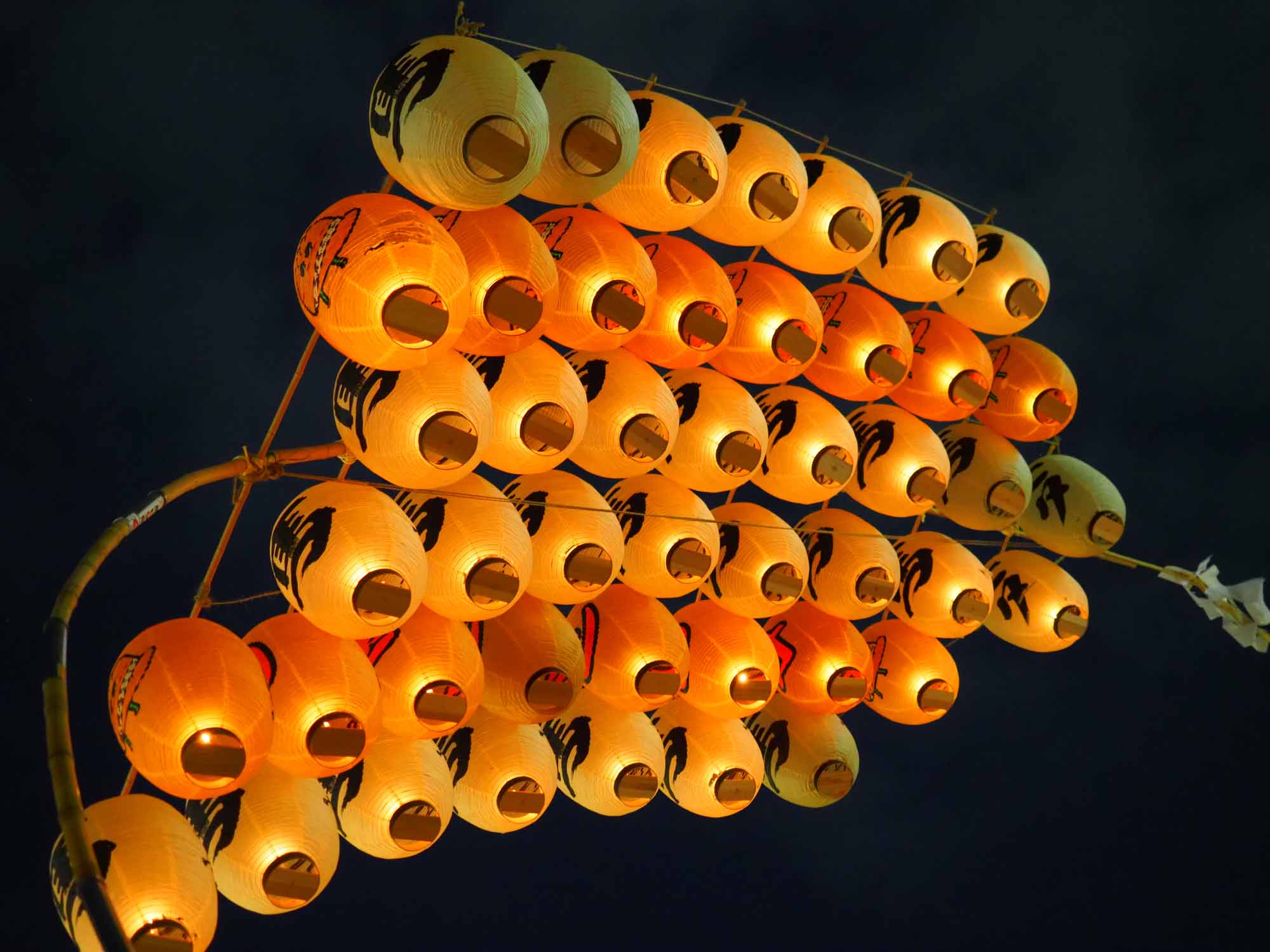 お囃子に合わせて、次第に竹竿を継ぎ足してしなる竿燈がユラリとする様子はスリリングで、始めてみた人も多いらしく「すごい、すごい」と歓声が聞こえる。