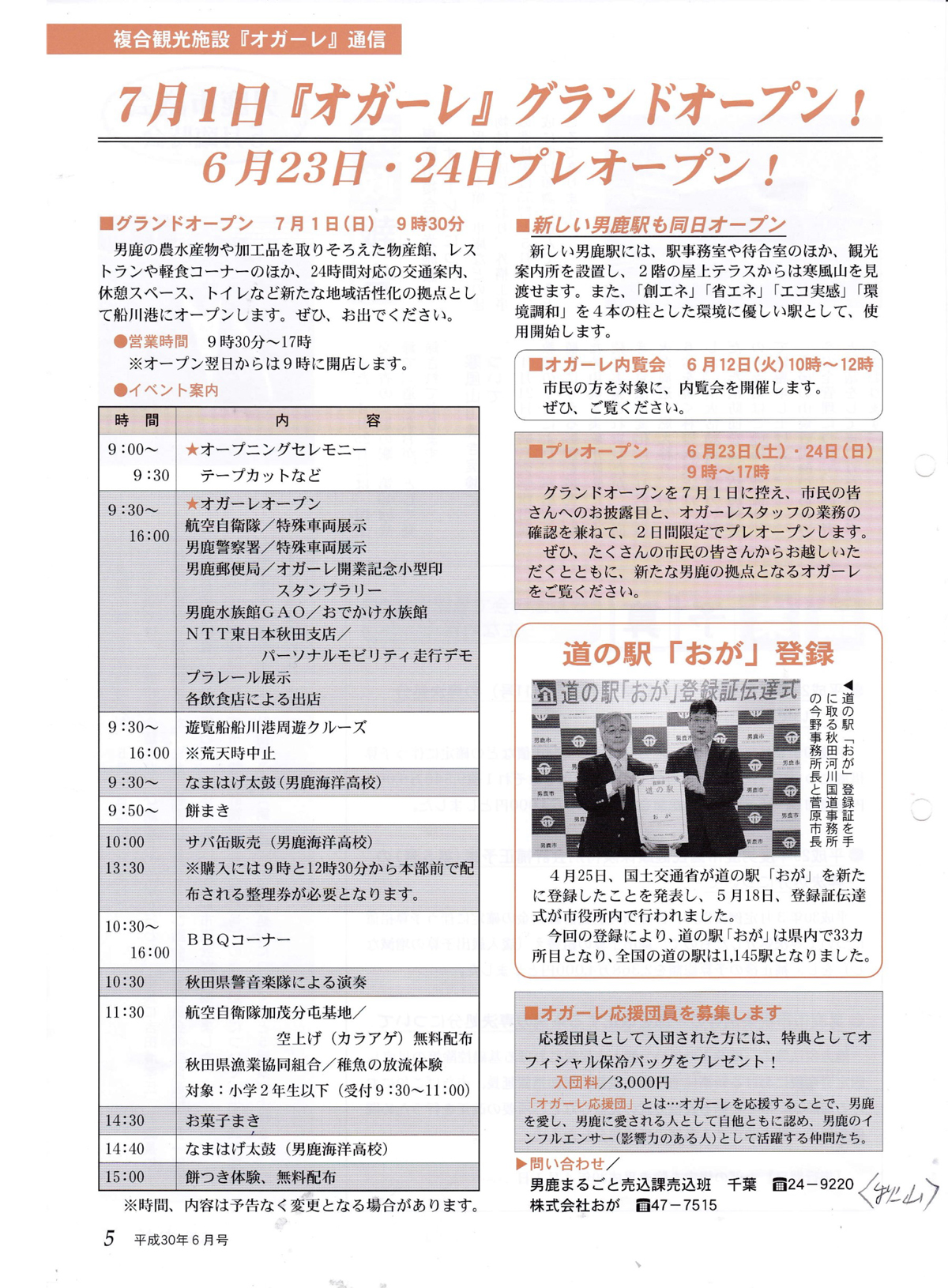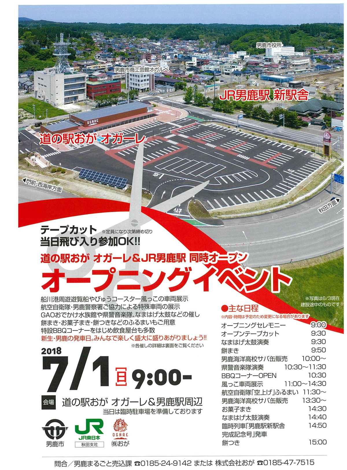 平成30年7月1日(日)に「複合観光施設オガーレ開業」と「男鹿駅新駅舎完成」を記念して、オープニングイベントが開催されます。 当日は、オガーレと男鹿駅を約200mのテープで結び、テープカットを行うほか、下記チラシのイベントを実施されます。