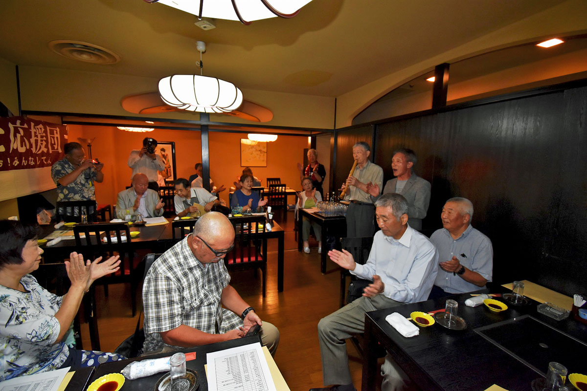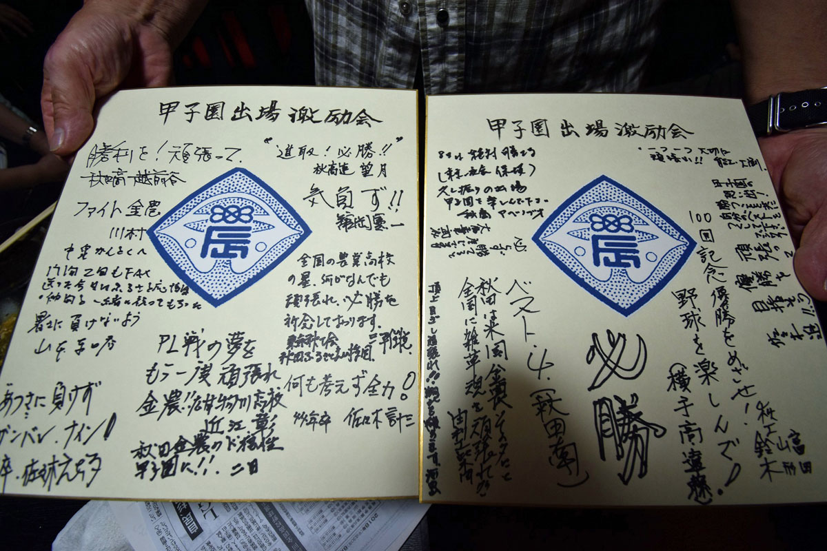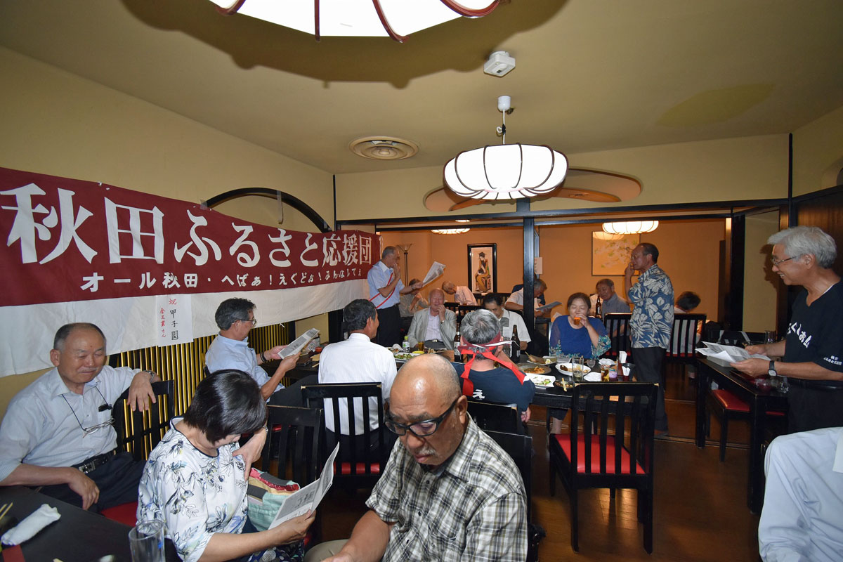 懇親会では、PL学園のKKコンビとの闘いの話題などと秋田県民歌・県民の歌・栄冠は君に輝く・秋田ふるさと応援団歌・金足農業高校校歌を全員で歌い・大渕清一氏(能代工)と菊地錬次郎氏(金農)お二人の力強いエール合戦を行い大いに盛り上がりました。