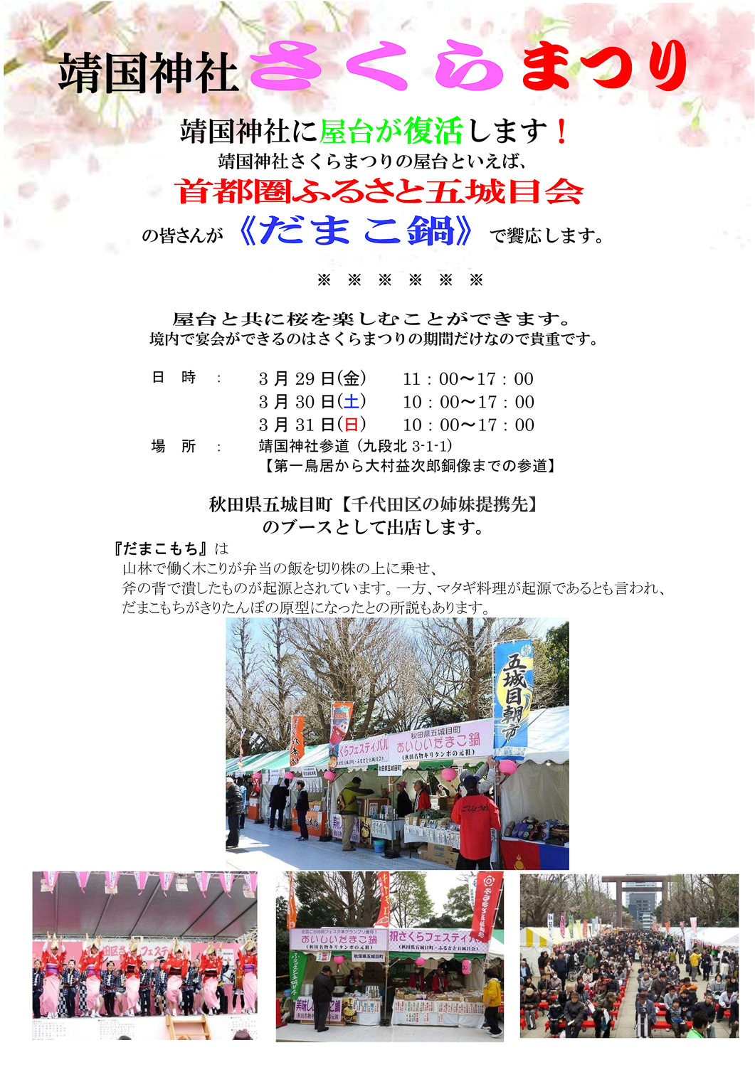 五城目町の姉妹都市・千代田区で開催される「さくらまつり」に、ふるさと五城目会が参加します!