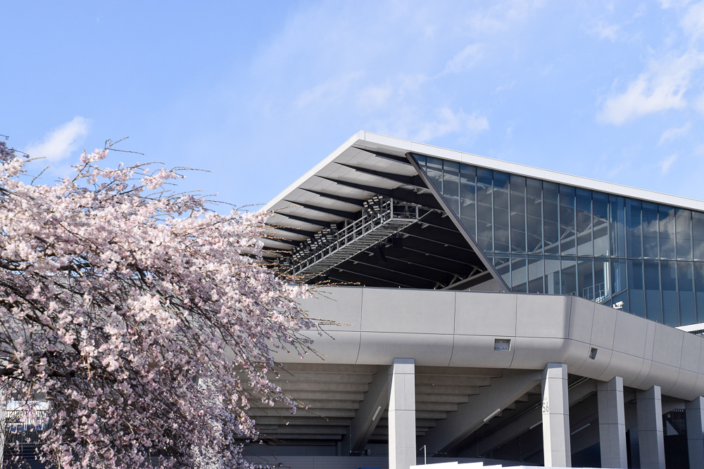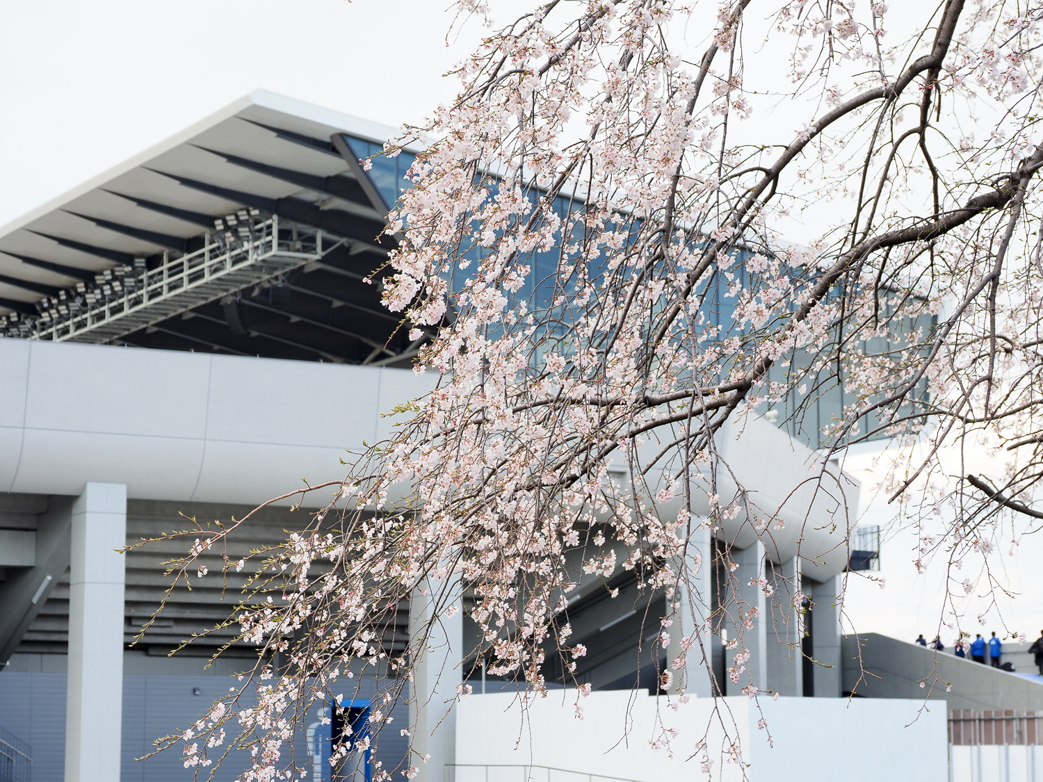 この日は青空が見えるなか強風が吹き体感温度は低かったですが、熊谷市は桜が6、7分咲きでした。今年9月から10月にかけてラグビーワールドカップが開催されるラグビー場の一部が見えました。