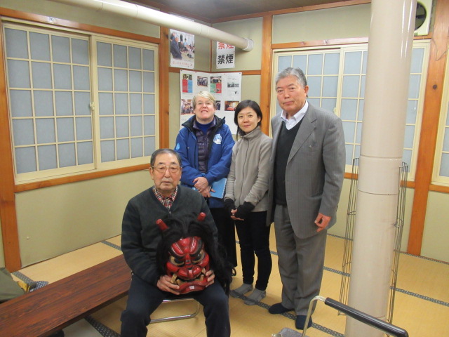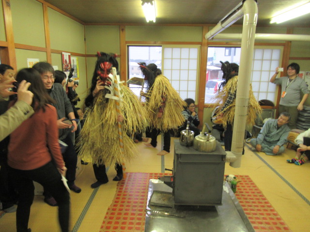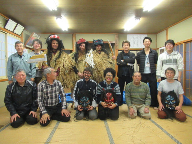 増川地区では12月15日には復興庁で実施の仙台の(株)第一広告社と(株)JTB共催「新しい東北・交流拡大モデル事業」として東北大学大学院他5名の留学生を 受け入れ なまはげの衣装づくり、作ったケデを着てなまはげを実演してもらい。また、はたはたのすし、はたはたのしょっつるを食べてもらい大変好評でした。