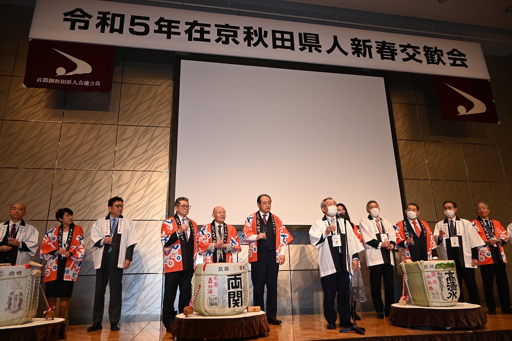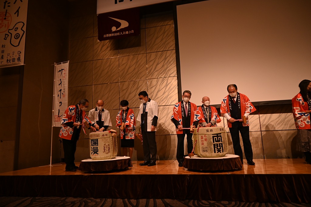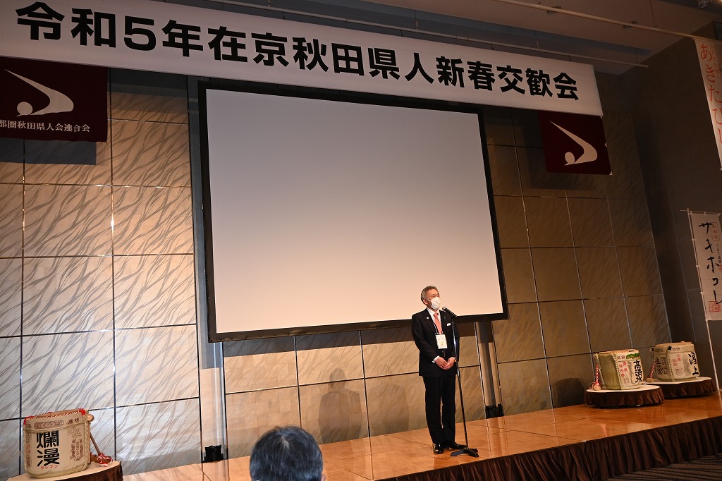 県民歌斉唱・主催者挨拶・秋田県副知事猿田和三氏・首都圏秋田県人会連合会会長菊地昭夫氏が挨拶しました。来賓紹介・鏡開き・乾杯し21時に閉会しました。