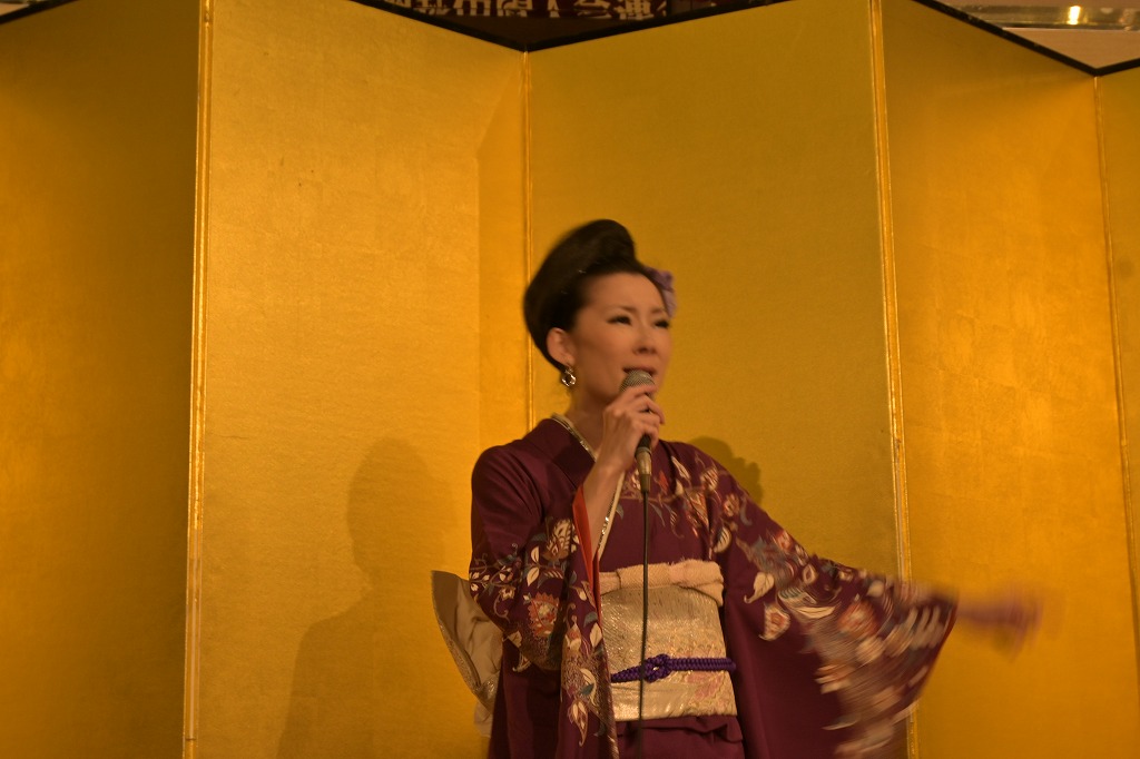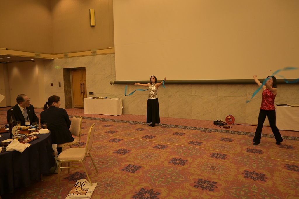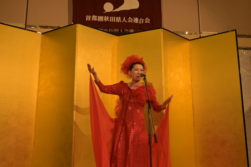 懇親会では、秋田県民歌斉唱。鏡開き・乾杯後に北秋田出身のものまねシンガー翔子のライブや参加者の民謡・尺八・カラオケなどで盛り上げました。各テーブルに一升瓶の地酒を飲みかわしました。なお、秋田ふるさと応援の会員10名が参加しました。