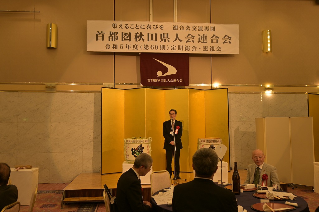 会長挨拶では、「コロナ禍により3年振りに懇親会では乾杯をすることができました。皆さんとお酒を飲みながら懇親を深めたい、来年の70周年記念総会に向けて皆さんと一層結束をお願いしたい。また、県出身者の縁を大切にし親睦活動を頑張っていきたい、第60回芸能大会を11月4日に開催しますので、引き続き皆様にご協力をお願いしたい」。