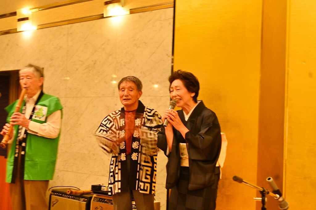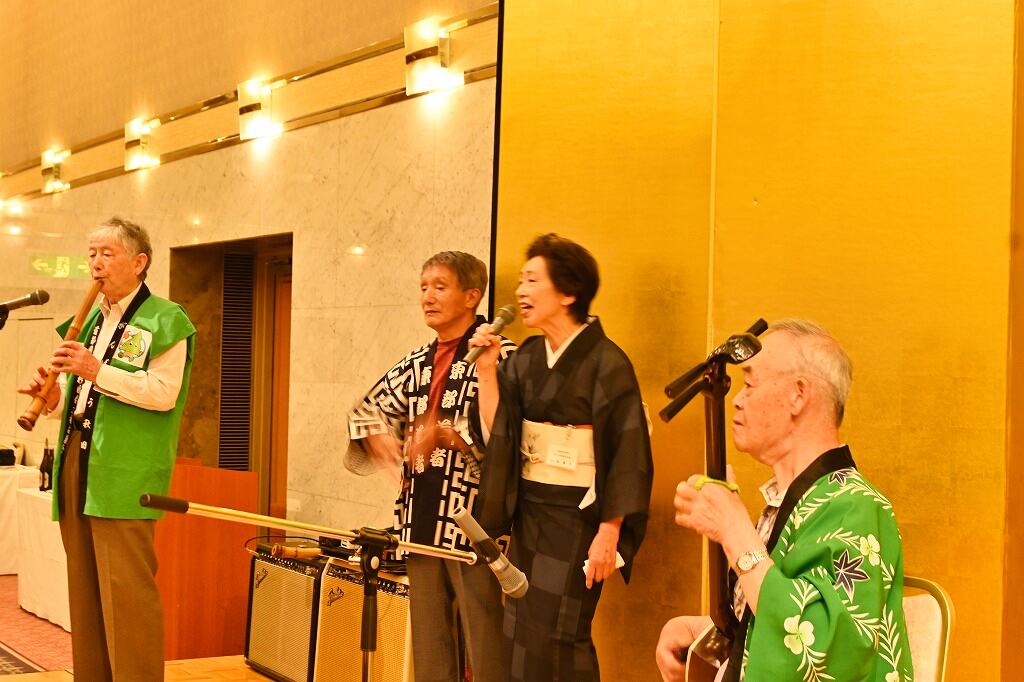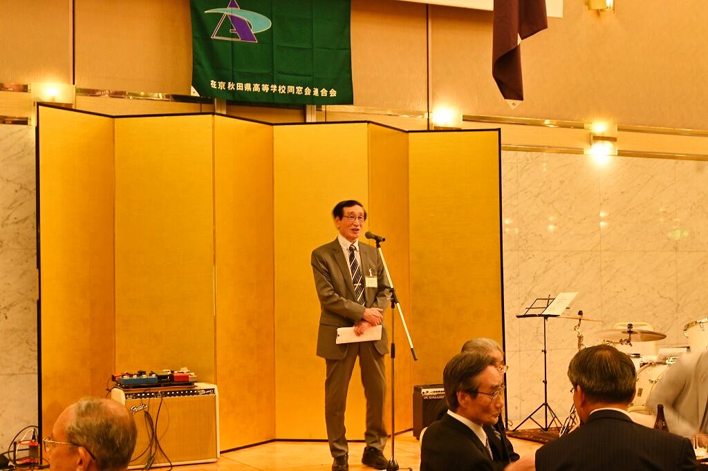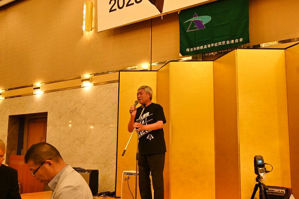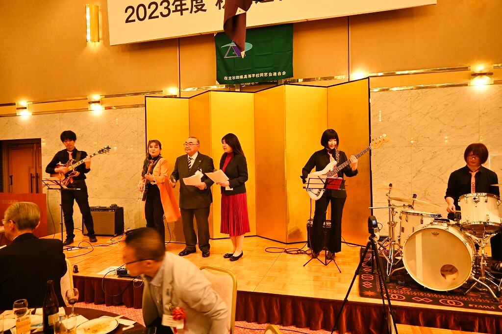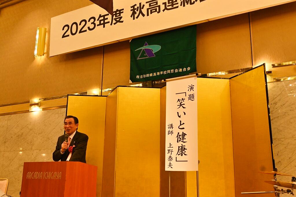 フリーアナウンサーの上野康夫氏(秋田県立大曲高校出身)が「お笑いと健康」というテーマで講演し、ユーモアたっぷりのトークで皆さんの笑いを誘いました。民謡や西馬音内盆踊り、ベンチャーズの曲を演奏するバンドが、「真っ赤な太陽」など数曲を演奏し、最後に「青い山脈」や「高校三年生」を全員で歌い、会場が大いに盛り上がりました。