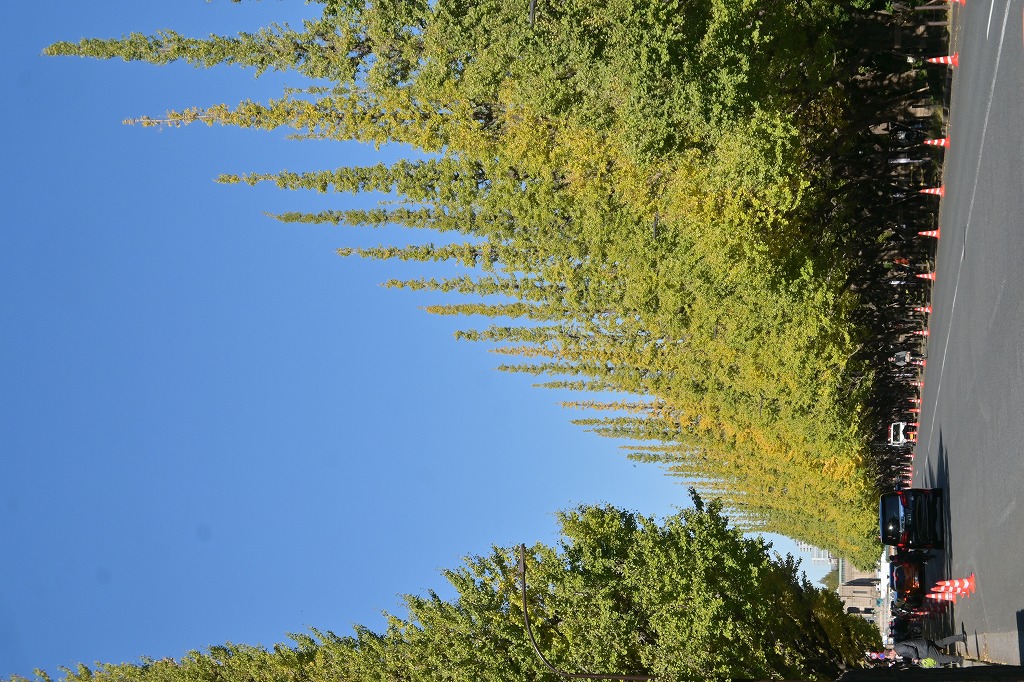 当日は秋晴れの雲のない素晴らしい天気でしたので、外苑前銀杏並木に立ち寄ってきました。上部が少し黄葉しておりました。月末が見頃を迎えると思います。多勢の観光客が楽しんでました。