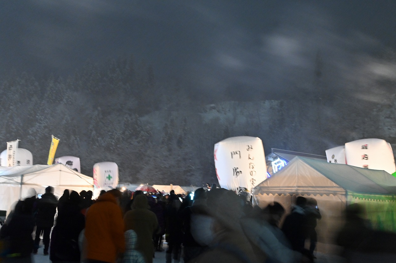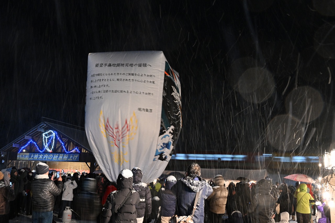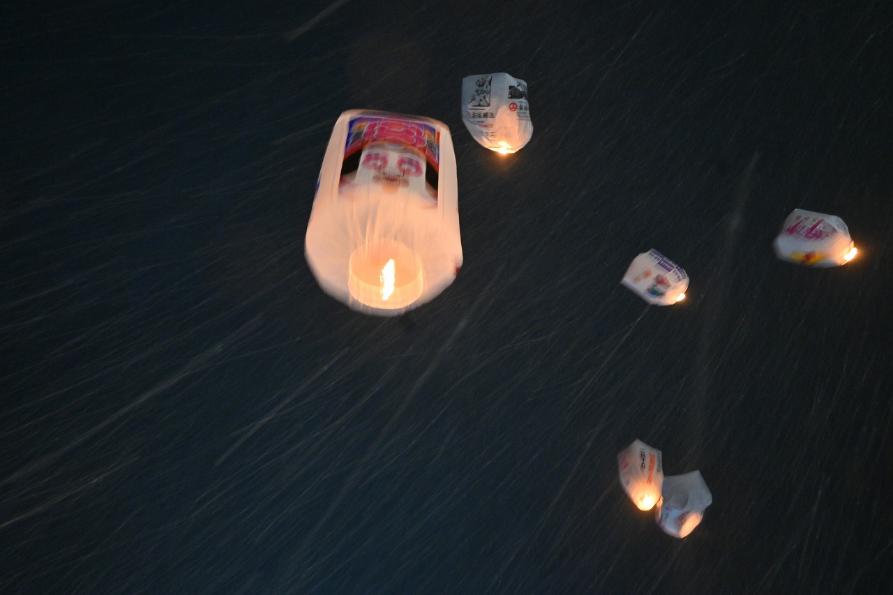 午後6時からの小中学生の紙風船に続き、7時に地元集落が一斉に打ち上げました。夜になり湿った雪が降り始め紙風船が濡れて上がるのが心配されました。