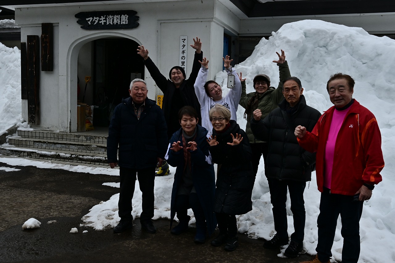 秋田ふるさと応援団から三平・松田氏が参加しました。1時にみんなの実家・門脇家に集合して9名が門脇さん運転のワゴン車に乗り途中、打当温泉に入浴し体を温め、会場近くの門脇氏親戚宅に駐車し、休憩。歓待され漬物が美味しくお世話になりました。また戸沢集落のテント内で門脇氏の兄が仕留めたクマ鍋(私が初めて)がおいしく、超熱燗を飲み体が温まり元気が出ました。