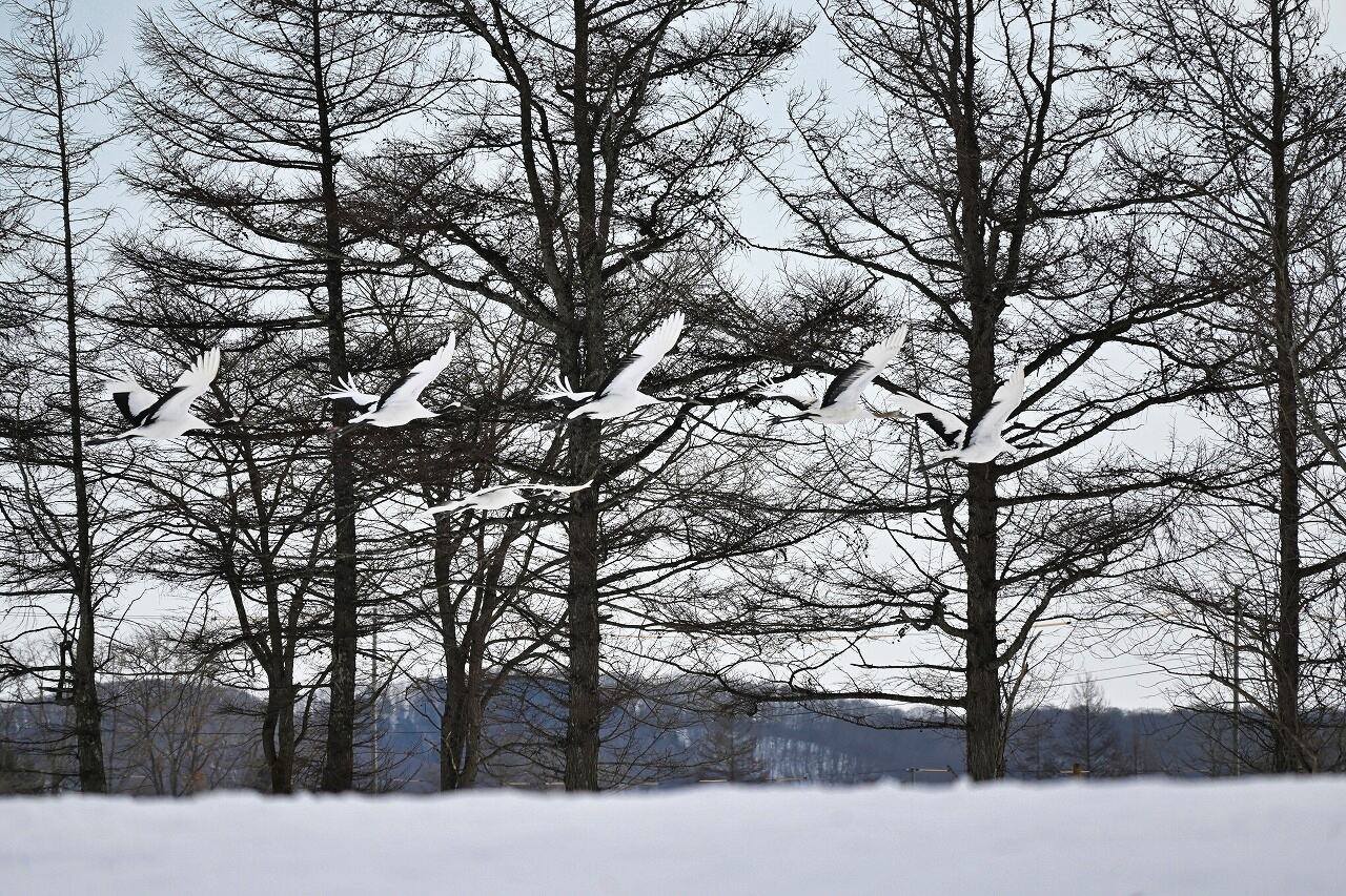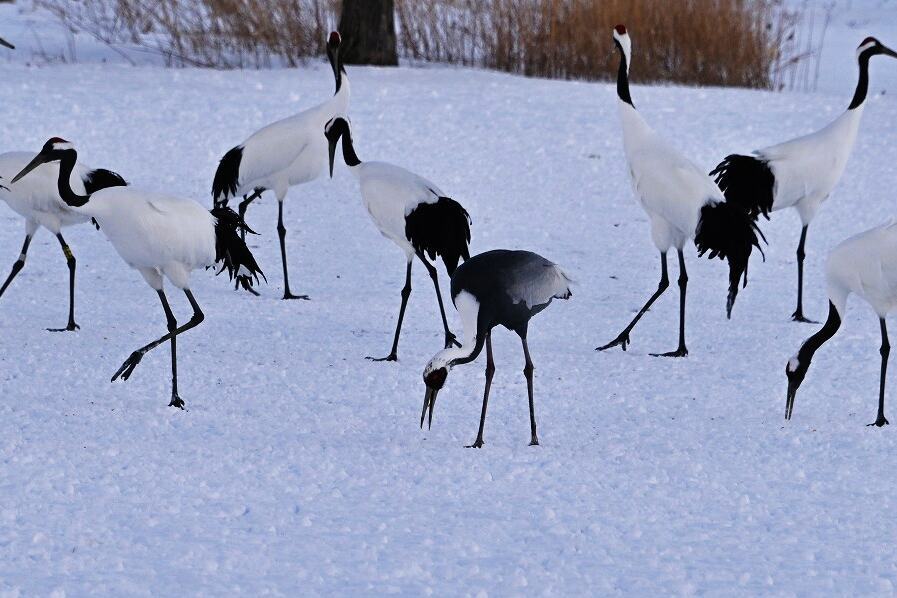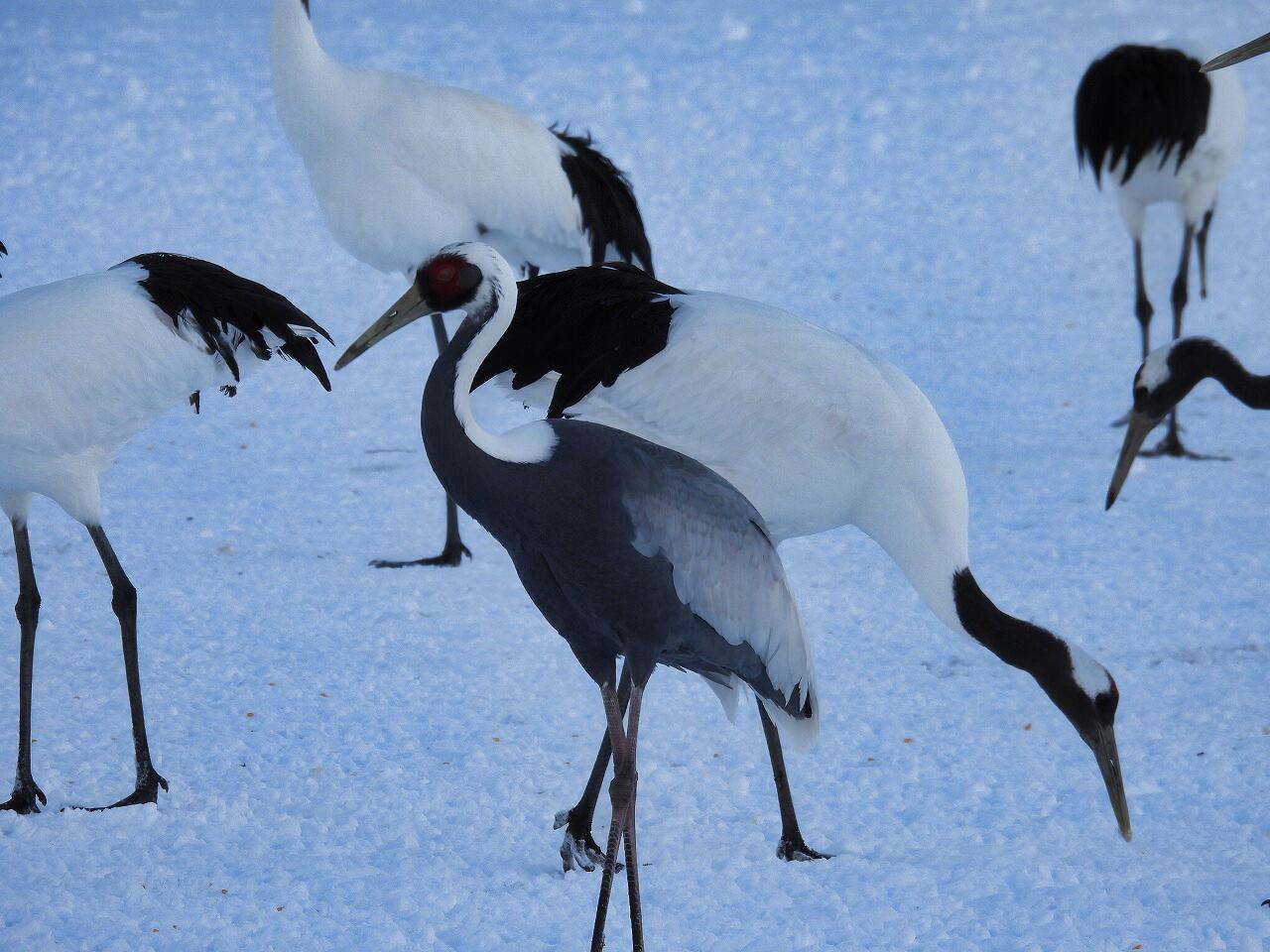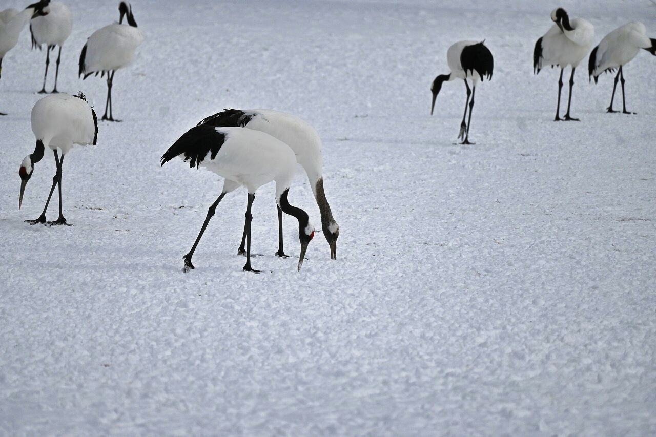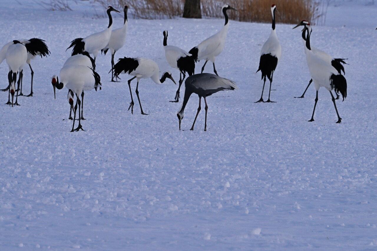 成鳥は赤い冠・幼鳥は茶の冠です。珍しい珍客黒ツルがタンチョウツルに混ざって餌をつまんでました。現地の方は音羽橋から、朝明けに一斉に飛び立つツルが見応えがあり、各地のカメラマンが多数撮影されるようです。機会があったら挑戦したいです。2時間ほど撮影しましたが寒かったです。