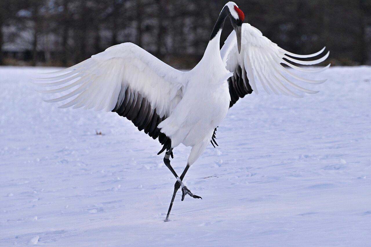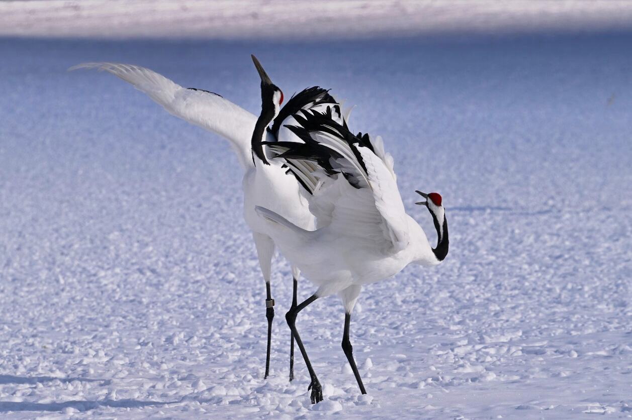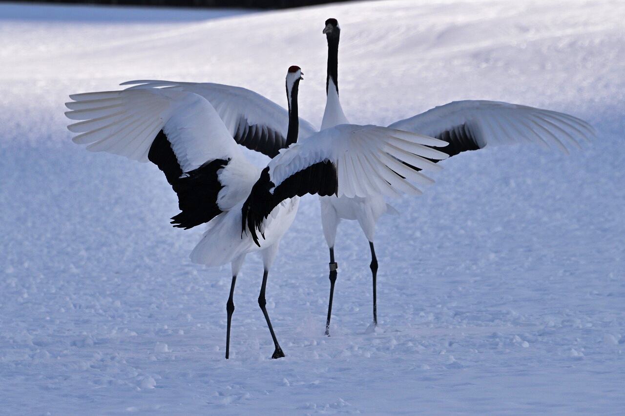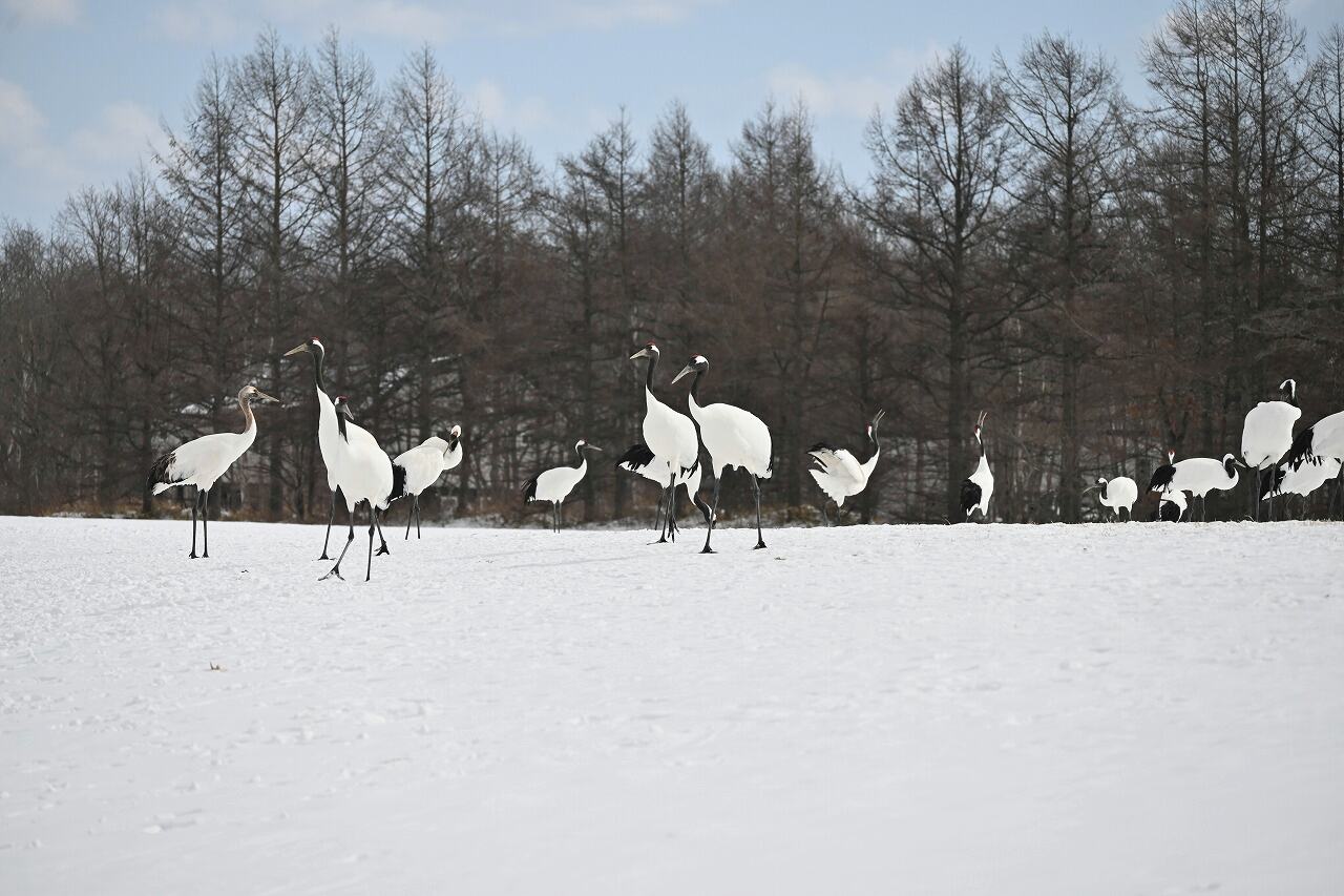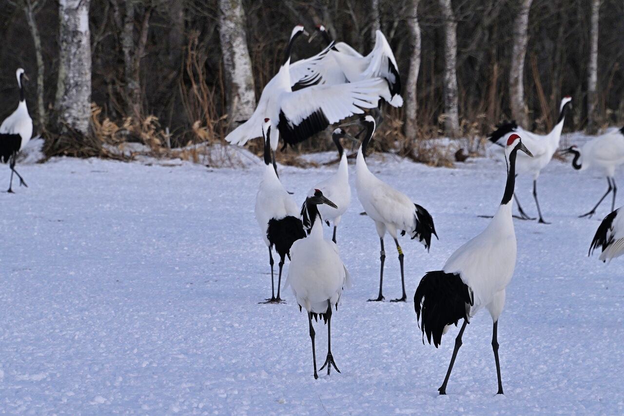 成鳥は赤い冠・幼鳥は茶の冠です。珍しい珍客黒ツルがタンチョウツルに混ざって餌をつまんでました。現地の方は音羽橋から、朝明けに一斉に飛び立つツルが見応えがあり、各地のカメラマンが多数撮影されるようです。機会があったら挑戦したいです。2時間ほど撮影しましたが寒かったです。